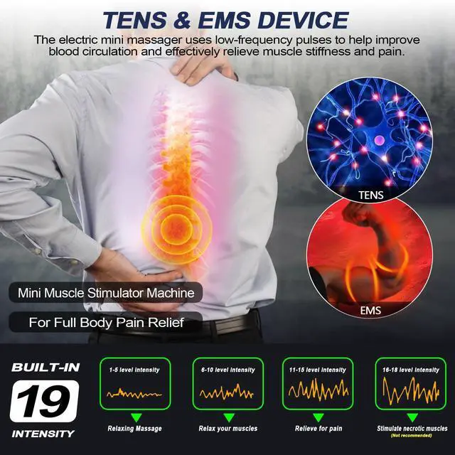 Pain Relief : Our electric pulse massager designs with 8 modes and 19 adjustable intensities to meet your different needs. It is recommended to put the tens unit massager on your skin before start and gradually increase from intensity 1 to a comfortable range. Through low-frequency pulse massager technology deeply relax neck muscles. Help to relieve shoulder and neck muscle tension,fatigue