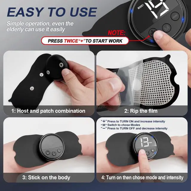 2 Reusable Electrode Pads :Two replacement pads of different shapes are durable,breathable,easy disassembly,safe and non-irritating,soft and high fit. Ideal for sore and aching muscles in waist, back, neck, arm, leg and shoulder. Avoid using it on vital areas such as carotid sinus nerves,chest or brain. If need more pads, search: B0DQ96V6PP