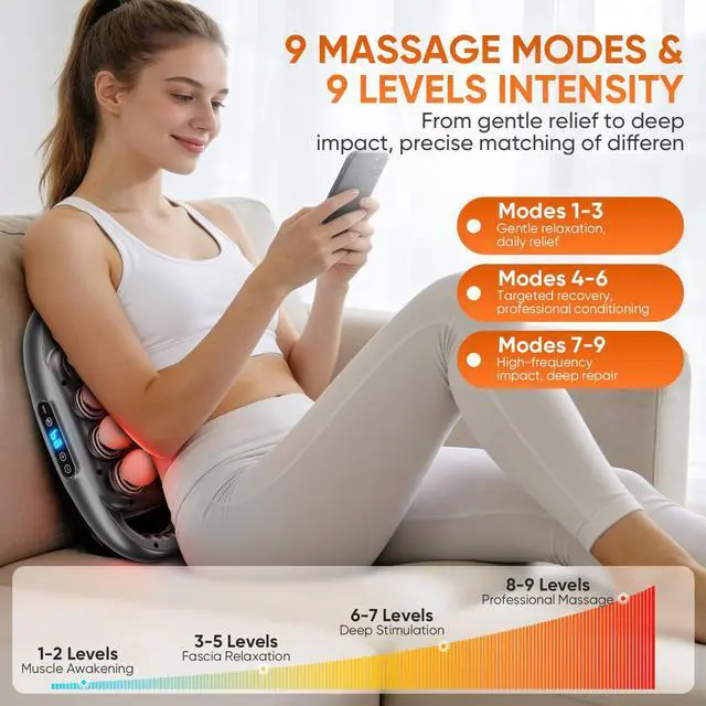 9 Modes & 9 Intensities: Modes include Gentle Relaxation (1-3), Targeted Recovery (4-6), High-Frequency Repair (7-9); intensities cover Muscle Awakening (1-2), Fascia Relaxation (3-5), Deep Stimulation (6-7), Professional Massage (8-9). This back massager for pain relief deep tissue fits diverse needs, rivaling pro massages.