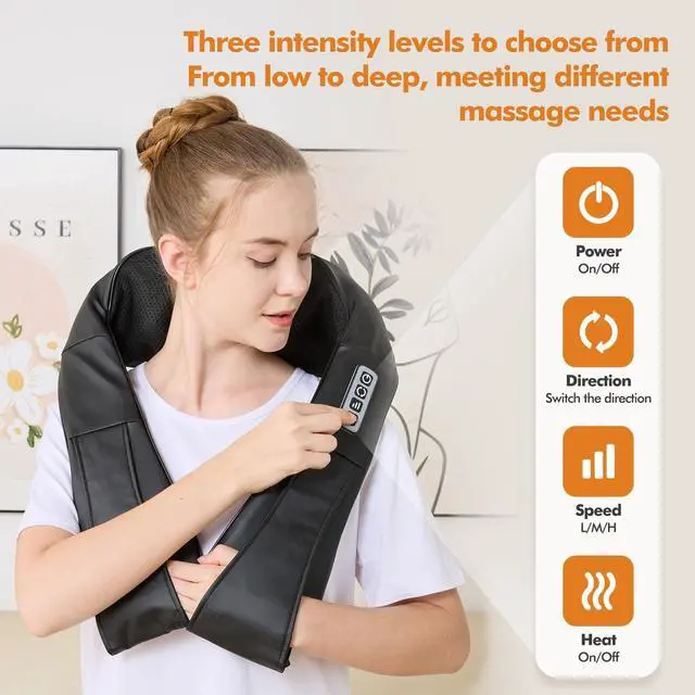 Versatile for All Users Neck and shoulder massager featuring four intuitive buttonsON/OFF, rotation, intensity, and heatingthe shoulder massager offers effortless operation. Multiple modes from gentle to deep tissue ensure every family member finds their ideal massage strength