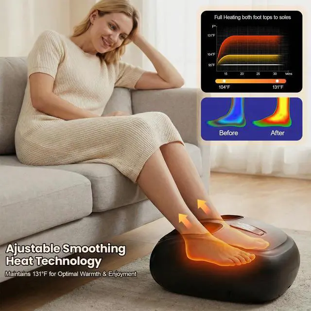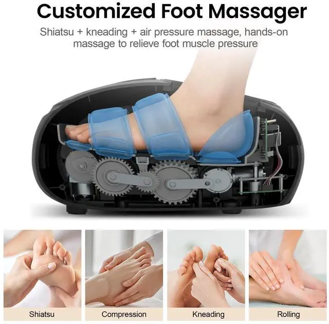 Professional-Grade Multi-Massage Therapy: This shiatsu foot massager combines deep kneading, rolling, air compression, and vibration to target your soles, arches, and heels. Use each function individually or in combination for a fully customized massage. It effectively relieves pain from plantar fasciitis, neuropathy, and daily fatigue while promoting better blood circulation and overall foot wellness.