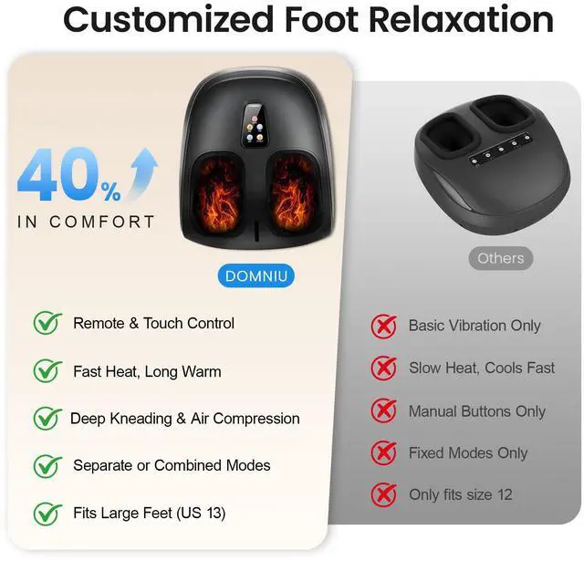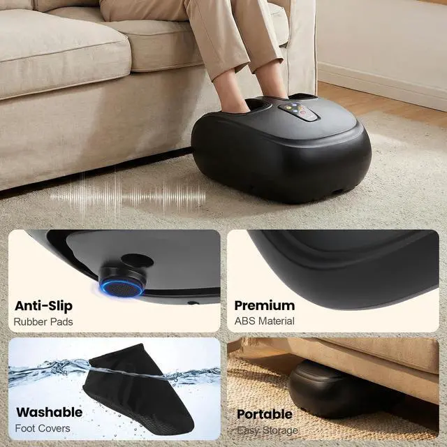 Ergonomic Design for Home & Travel Use: Designed for feet up to size 13, this massager features a lightweight body with premium ABS material and anti-slip rubber pads for stable, quiet operation. The washable foot covers ensure hygiene, while the compact shape allows for portable easy storage in a closet or under a bed.