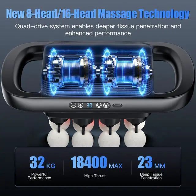 8-HEAD MASSAGE GUN: Our muscle massage gun integrates a high-powered motor, 25mm high-intensity massage, reaching deep muscle layers, breaking stiffness, relieving soreness, and completely releasing stress Ideal for accelerating recovery after workouts or providing daily stress relief, it ensures optimal performance with each session. UpgUPGRADED 16-HEAD FLAGSHIP MODEL: 16-speed transmission system powerful performance and precise control.The upgraded four-link transmission system uses high-quality metal components, which can output power stably even under high load 3 MAIN MODES: 30 intensity levels of intelligent adjustment of top tips, can effectively target specific muscle groups. From deep tissue treatment to gentle relaxation, our massagers provide multiple solutions for various recovery and relaxation needs. LONG BATTERY LIFE, ULTRA-QUIET: Our new 8-head massage gun uses Type-C fast charging and a powerful 2000mAh battery to ensure up to 2 hours of uninterrupted use. High-quality motor with triple barriers of noise reduction, shock absorption and sound insulation, no interference and noise-free operation, suitable for any environment, including home, office or gym environment. BEST GIFT CHOICE: Our muscle massage gun is the perfect gift for fitness lovers and relaxation seekers. It offers powerful muscle relief for effective recovery and daily relaxation. Crafted for durability with advanced features, it ensures an exceptional user experience. Whether for birthdays, holidays, or any occasion, its a thoughtful gift promoting well-being.