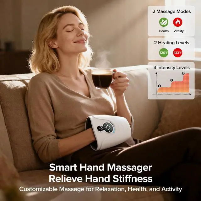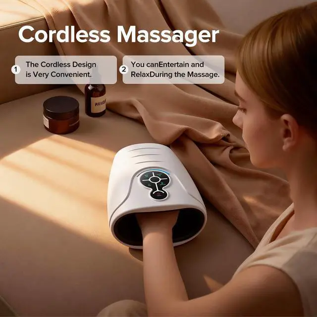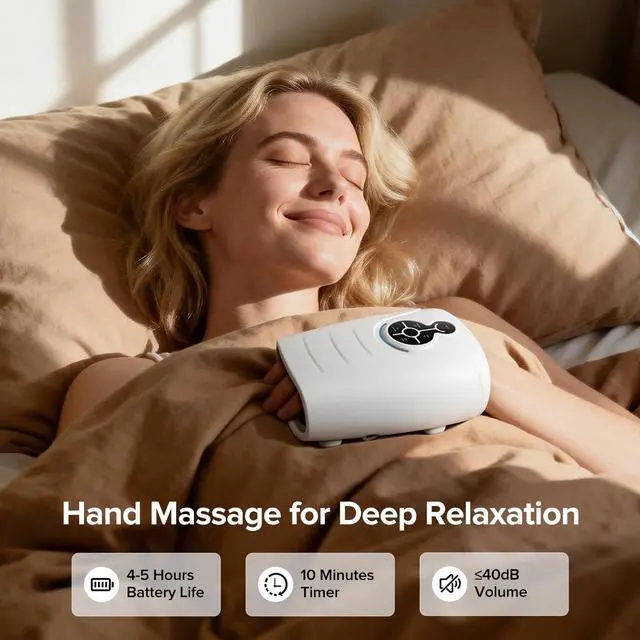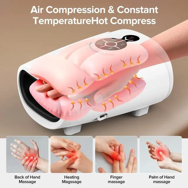 Unique hand massager uses air compression to apply pressure to the palms, backs of hands, and fingers to relieve muscle tension