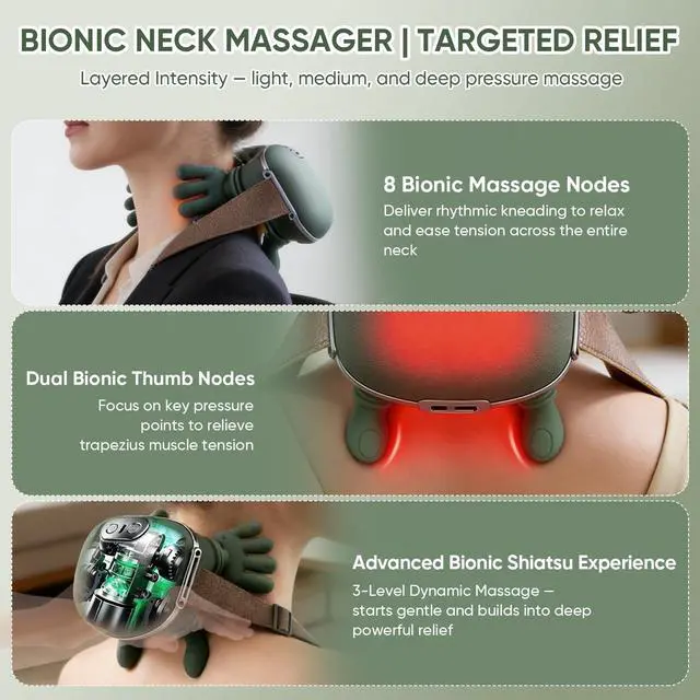 Bionic Neck Massager with Adjustable Heat, Portable Deep Tissue 4D Kneading Electric Shoulder Massager, Compact Design with Soft Silicone Massage Heads for Relaxation and Comfort