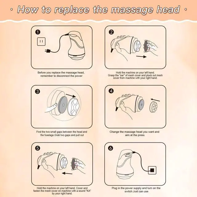 • 8 MASSAGE HEADS+1 MESH COVERSIncludes 8 interchangeable heads (1 attached to the massager, 7 in the accessory bag) and 1 mesh cover to prevent hair from getting caught in the device.