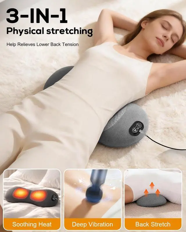 3 in 1 Lower Back Massager, Triple Fusion Back Massager with Heat, Vibration and Stretch, Lumbar Support Pillow with Ergonomic Memory Foam for Bed and Chair