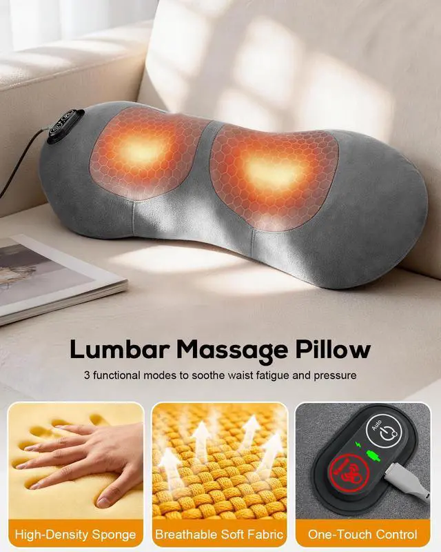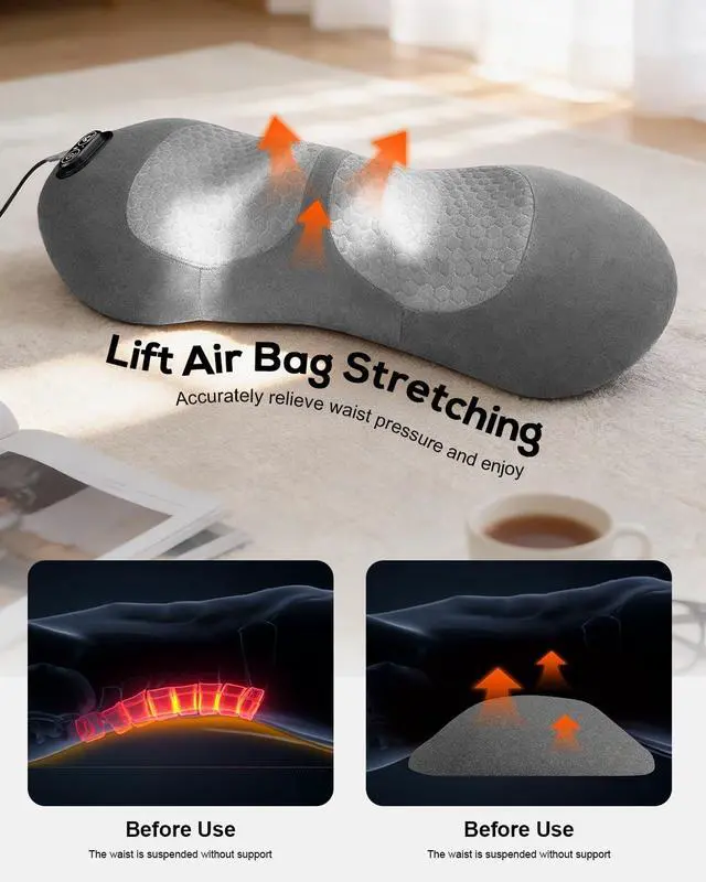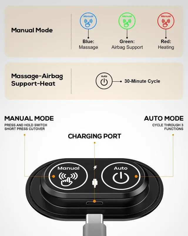[3-in-1 Lumbar Support with Massage & Heat] Combines vibration massage, constant-temperature heating, and intelligent air lift in one device. Automatic mode cycles through functions, while manual mode lets you select a single function for personalized comfort during daily use.