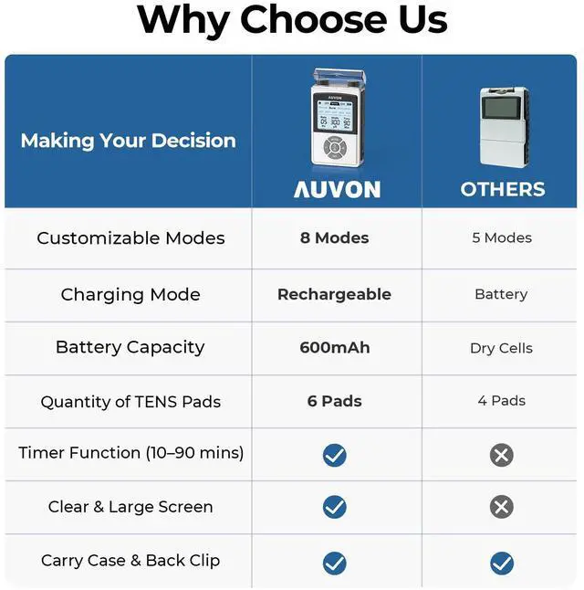 8 Customizable Modes: AUVON PT1 Pro TENS unit features 8 modes with adjustable settings, which allows you to choose the frequency and pulse width freely according to your physical therapist's advice and your body condition. This back pain relief device is designed with 40 levels, offering you more options for relief therapy without shock feelings. You can also operate it with different level settings through the A/B channel