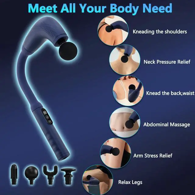 • Extension Handle & Ergonomic DesignOur massage gun feature an easy to grip elongated handle with an ergonomic 120° curve that allows you to effortlessly reach and deeply massage hard-to-reach areas such as the shoulders, neck, lower back, back and feet, helping you to quickly relieve post-training pain and effectively relax.