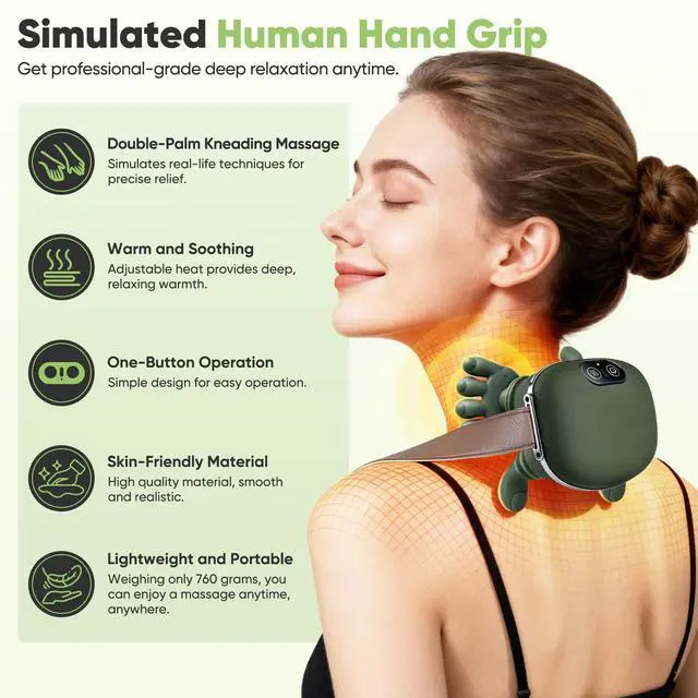 Shoulder and Neck Massager, Bionic Heated Massager, Neck Massager with Fingers, 4D Kneading Massage, Simulates a Real Palm Massage for Comfort, Relax Muscle Tension (Green)