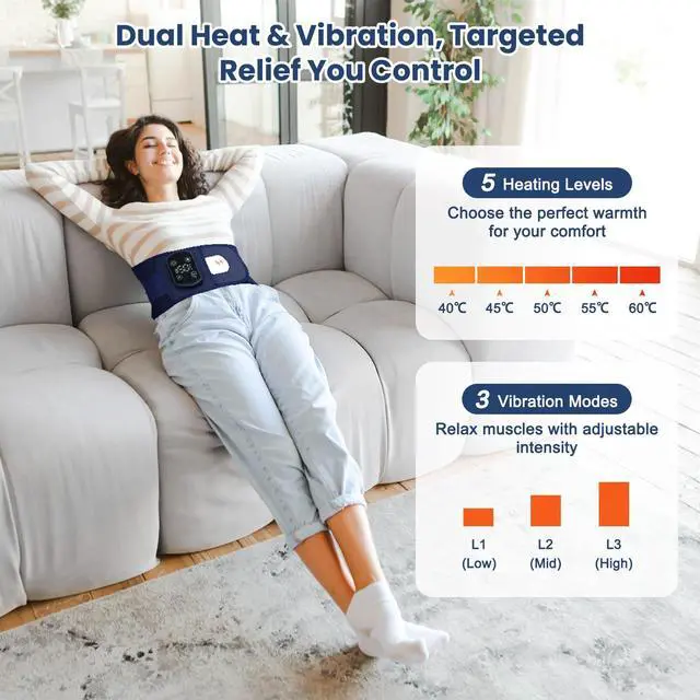 Customizable Heat & Massage Settings This lumbar massager offers 5 distinct heat levels (ranging from 40°C to 60°C) and 3 vibration intensity settings, providing customizable relief. Whether you need a soothing heat to relax or intense vibration for targeted massage, it delivers effective pain relief and muscle relaxation for your back, abdomen, and more.