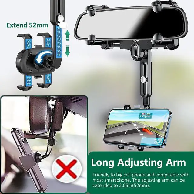 This cell phone holder for car adopts a retractable double four-claw design ensures securely locks rear-view mirror and firmly grips your phone. Each claw has soft rubber pads that will not cause damage to your rearview mirror, easy to clean.