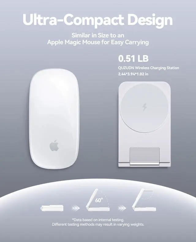 • Strong Magnetic AlignmentSecure & Stable Charging: Built-in powerful N54 magnets and compatible with Mag-Safe charger, The foldable charging pad's strong magnetic suction ability allows your device to be easily aligned with the charging area, Note: Non-Mag-Safe cases may weaken magnetic adsorption. For stronger attachment, we recommend using a Mag-Safe-compatible case