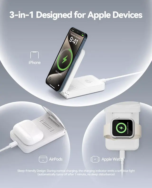 • 3-in-1 Magnetic Charging station for Apple Devices: Charge your iPhone, AirPods, and Apple Watch simultaneously, all while enjoying the versatility of the built-in adjustable stand. (Note: For optimal charging, use the provided 30W USB-C PD wall charger.) For iPhone 17 16 15 14 13 12 Plus /Pro/ Pro max/Air (Note: Magnetic suction function does not support iPhone 11 to 8 Series), It is also compatible with Apple Watch Ultra 11 10 9 8 7 6 5 4 3 2 & AirPods 2/3/4 Pro (Note: only support AirPods with magnetic devices)