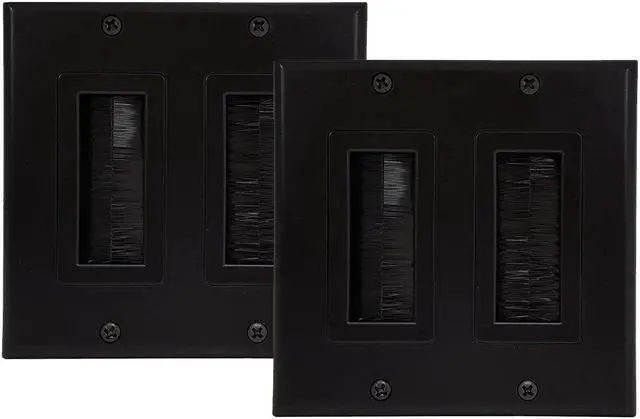 This black dual gang wall plate with brush bristles allows for a clean, tidy, and professional look for your outlets. The wall plate allows the cables running behind your walls to exit the wall and connect to your devices. The aperture is large enough for VGA, HDMI, Cat5e/6 and other types of cables, creating a unified and organized home theater setup.