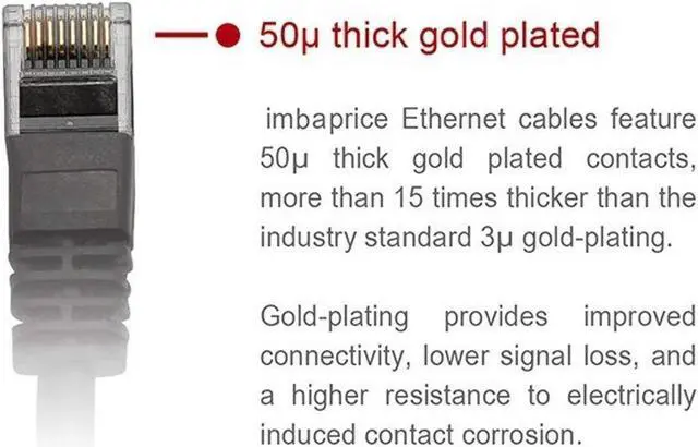 This Cat5e Ethernet patch cable is made with 100% pure copper. Our Cat5e cables feature a 50 micron gold plated RJ45 head. You can select a variety of colors -- Blue, Black, Gray, and White. All our iMBAPrice cables come with a lifetime warranty! Why copper wiring over aluminum? All our iMBAPrice Ethernet cable products are made with 100% pure copper wire. Why is pure copper better than the common CCA wiring? The CCA wiring (Copper Clad Aluminum) uses an aluminum conductor, a material less expensive than pure copper, coated with copper. In short what this means in terms of performance is that since CCA has a higher attenuation, there will be a lost higher chance of packet loss or data corruption at the physical layer. The longer the cable is, the higher chance of this happening is much more likely. In addition, CCA has lower tensile strength resulting the likelihood of cable damage through pulling or bending. However, with the use of pure copper wiring, the user will have more reliable connectivity and cable durability. That is why all iMBAPrice cables are made with 100% pure copper wiring. What does 50 micron Gold plated mean? On each end of this iMBAPrice Cat5e Ethernet patch cable contains a gold plated tip to maintain optimum conductivity. Since gold is a well known high conductive and non-corrosive metal, thicker gold plating means greater protection from corrosion, making your product last longer. Unlike the usual lowest grade gold plating thickness (3-6 micron) commonly found it other gold plated Cat5e cables, this gold plated RJ45 plug contains the highest grade of gold plated thickness available in the market -- 50 micron. Whether you install your cables high humidity environment, or a non clean air environment, our cables can handle Our iMBAPrice cables were made to last and we stand behind this statement with our lifetime warranty.