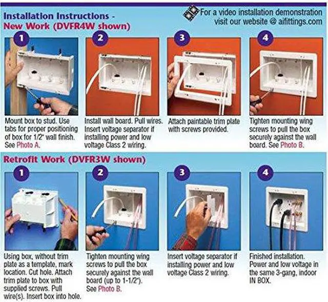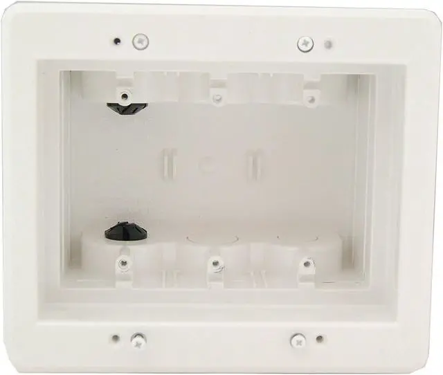 The DVFR3W triple gang InBox allows you to run high and low voltage cables behind the wall so your TV and furniture can be mounted or placed flush against the wall. Our recessed indoor INBOX works with new or existing construction. That means can work in your current house, or installed in a new house on a stud. It allows LCD, Plasma, Flatscreen TVs, and Furniture to be placed flush against the wall. Any outlet or switch will fit inside. Its a recessed box so plugs don't extend past the wall, like they do in a regular box. You can mount TVs flush or push furniture closer to the wall. It has positioning tabs for 1/2-Inch wall thickness to assure accurate placement on the stud. It has a textured, paintable trim plate to cover edges of cut drywall and keep your project looking professional. It can be installed horizontal or vertical. Each box has wings that automatically turn and tighten the box to the wall as they're screwed in. It also comes with screws to install.