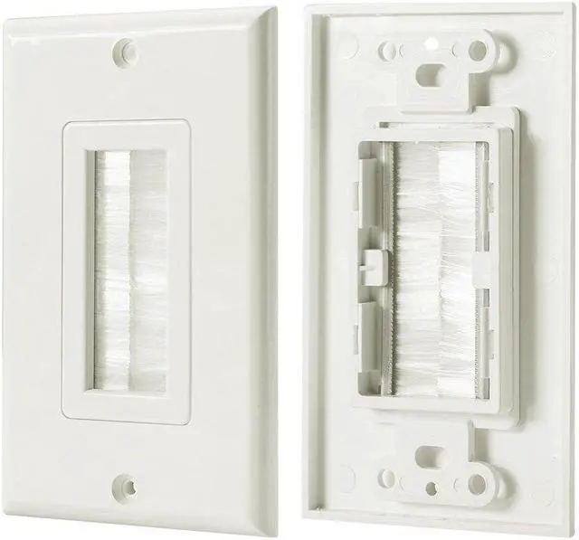 This single gang wall plate with brush bristles allows for a clean, tidy, and professional look for your outlets. The wall plate allows the cables running behind your walls to exit the wall and connect to your devices. The aperture is large enough for VGA, HDMI, Cat5e/6 and other types of cables, creating a unified and organized home theater setup.