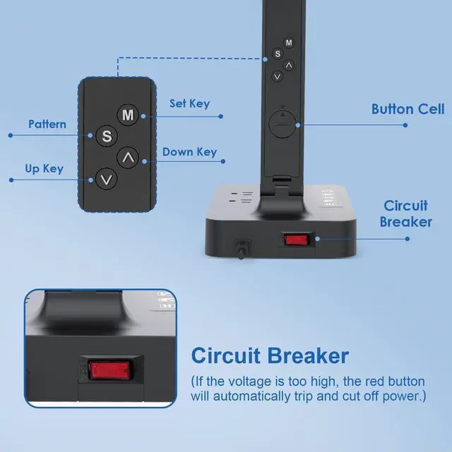 This is the overvoltage protection button of the desk lamp. When the voltage exceeds the range that the desk lamp can withstand, the desk lamp will automatically cut off the power to protect the safety of electrical appliances and circuits.