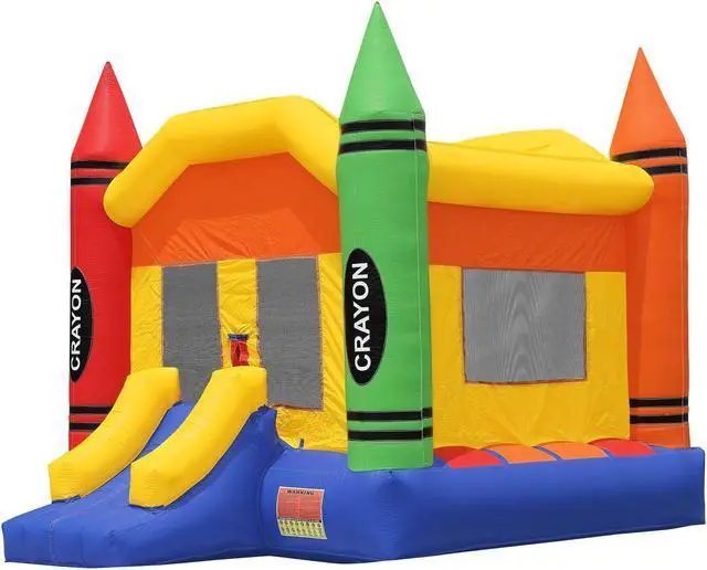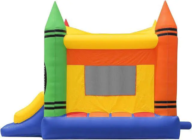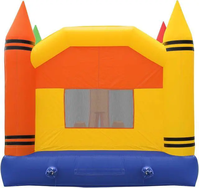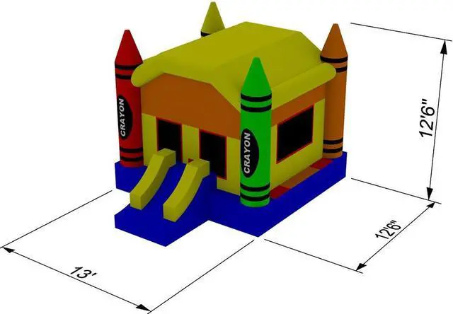 This commercial-grade Crayon Bounce House by Inflatable HQ is constructed from 100% PVC vinyl, from its upright pillars and beams to its slide walls. All high-stress areas including the bouncing surface, mattress sides, bottom, and slide are made from industrial strength, 15-ounce ( 0.47 mm) PVC. This (fire retardant and lead-free) puncture-proof PVC material is approximately 5 times stronger than nylon used in inferior units as it won't tear, fade, get moldy, and it's far easier to clean. Belting reinforcement is used at key stress points, & heavy-duty, multilayer stitching is used throughout.