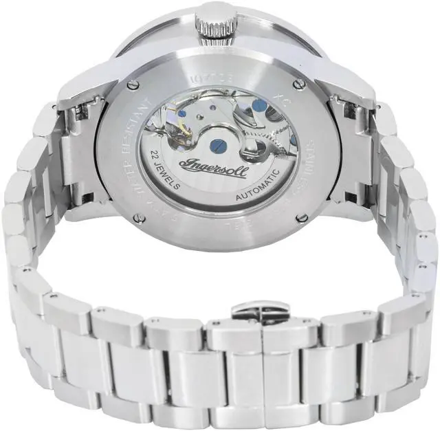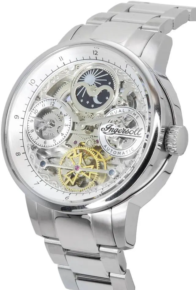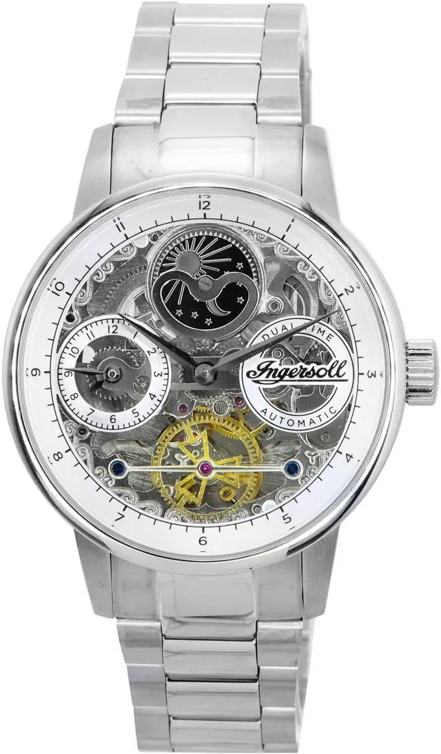Unleash your inner confident man with this smart and intelligent men’ s automatic watch from the Ingersoll The Jazz Watch Collection. The watch features silver-finished dial case and bracelet strap with oyster links. The silver dial plays the role of a showstopper with its two sub-dials in cut out design that equip the watch with multiple functional features like dual time and day-night tracker.