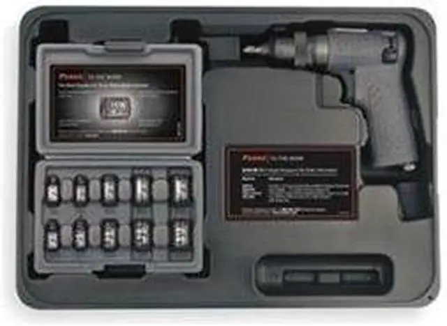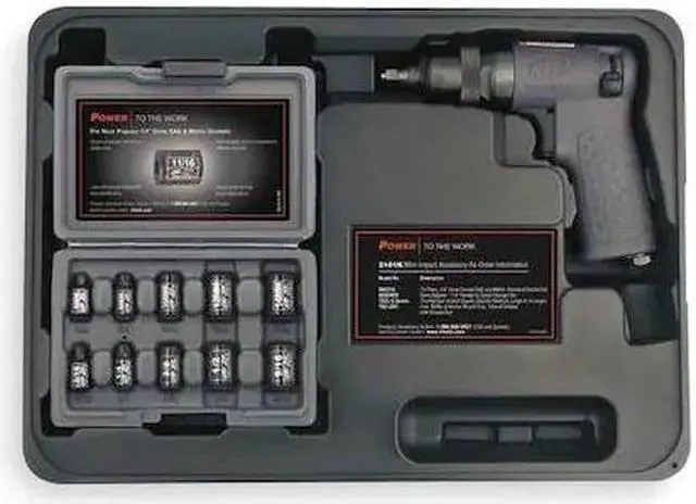 Air Impact Wrench Kit, General Duty, Standard Anvil, Square Drive Size 1/4 In., Max. Bolt Capacity 5/16 In., Torque Range 25 to 40 ft.-lb., Max. Torque 50 ft.-lb., Average CFM @ 15 Second Run Time 1.7, CFM @ Full Load 18.0, Free Speed 11, 000 rpmRing Retainer Type, Pistol Grip Style, Required Pressure 90 psi, Air Inlet 1/4 In. NPT, Min. Hose Size 3/8 In., Overall Length 6-1/4 In., Composite Handle Material, Handle Type Pistol Grip, Composite Housing Material, Tool Weight 1.37 lb. RestrictionsNote: For impact sockets, go to DrillSpot.com . Impact WrenchesLight- and general-duty wrenches are best for automotive, basic maintenance, and light production applications. Light-Duty Kit 1XFG7 includes 10-pc. socket set and carrying case. 5ZR88 includes 10 sockets, 2-oz. in-line oiler, oil bath clutch, and carrying case. General-Duty Kit 1FYV1 includes 2Z747 impact wrench, 4-oz. bottle of air tool oil, quick coupler, male plug, 3" extension, carrying case, and 1/2", 9/16", 5/8", 3/4", and 7/8" sockets.Max. psi: 90 Butterfly throttles on in-line units allow 1-handed forward and reverse control