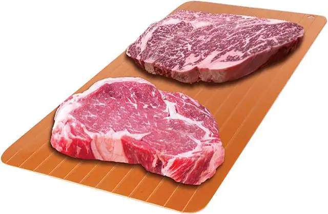 Defrost food quickly and safely right on your countertop. Cast copper defrosting tray draws cold away from food to thaw in half the time with no bacteria buildup. Meat defrosting tray is ideal for defrosting meats, poultry, fish and vegetables while retaining flavor. No more microwave thawing, and no electricity or batteries required. Non-stick thawing tray is easy to clean. Hole for convenient hanging or stores flat in drawer. 8" L x 14" W. Hand wash. TV Direct