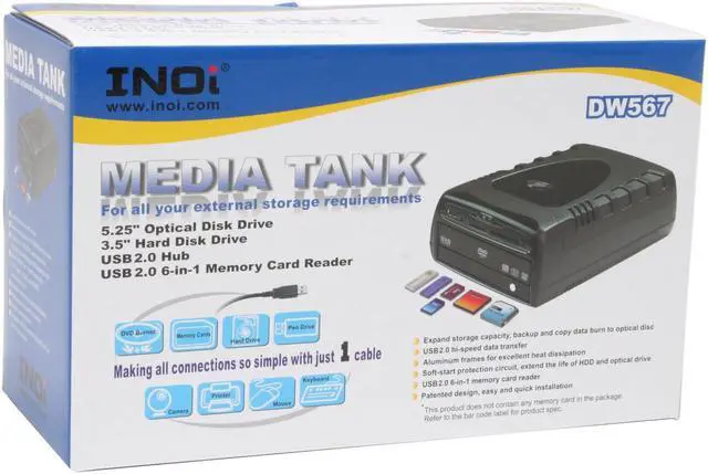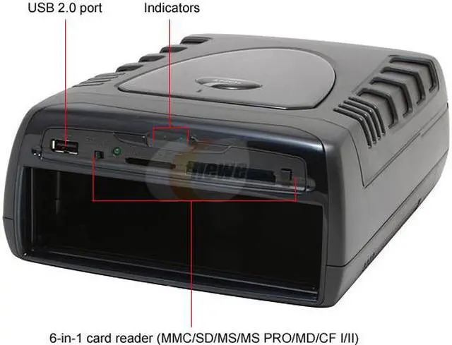 | Features | Supports all your USB 2.0 external storage devices in one housing. 5.25" ODD ( Optical Disk Drive ) 3.5" HDD (Hard Disk Drive) 6-in-1 card reader (CF I/II, MD, SD, MMC , MS/MS PRO) One USB 2.0 port Easy installation Soft-start circuit design to prevent surge current from damaging installed drives Cooling fan and aluminum heat sink design for maximum heat dissipation High speed USB 2.0 interface Perfect companion with MAC Mini |