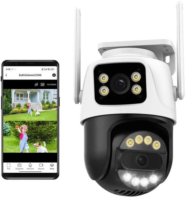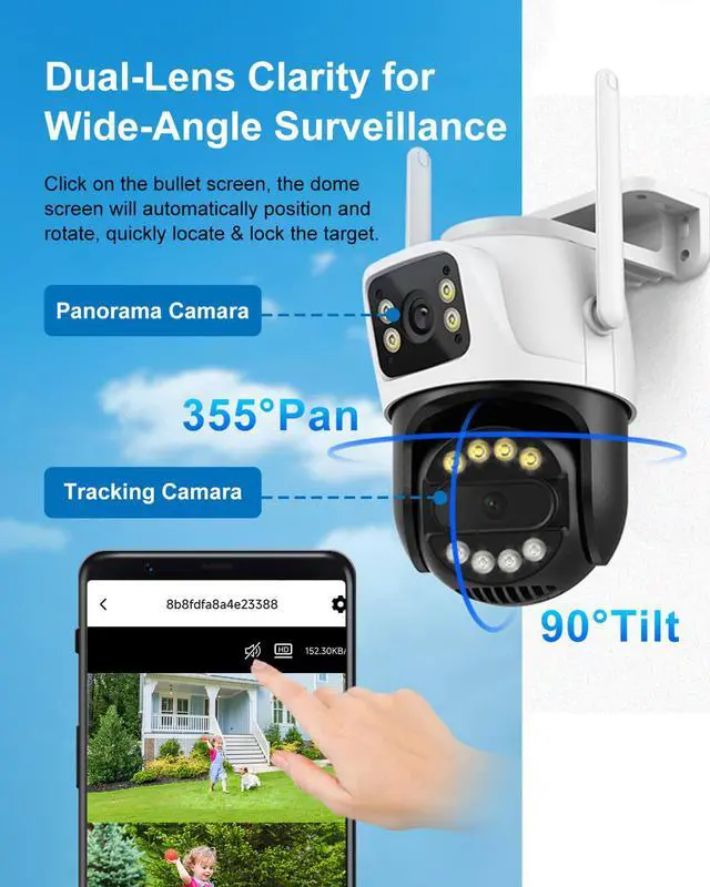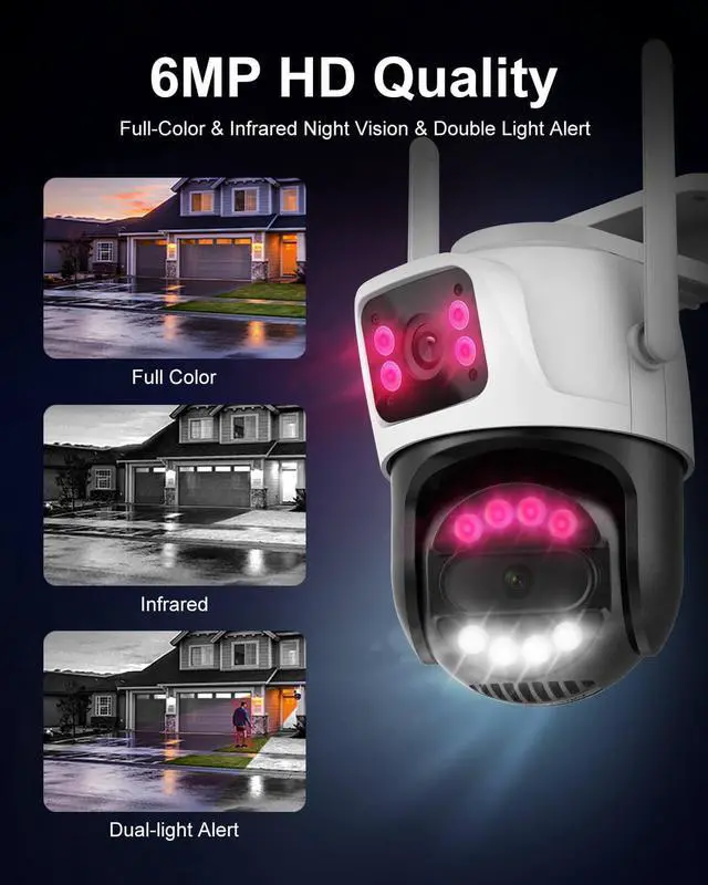 Experience comprehensive home security with our advanced 6MP Dual-Lens Outdoor WiFi Security Camera, designed to cover every angle with 355° horizontal and 90° vertical rotation. Equipped with two 3MP lenses, this camera provides clear, high-definition coverage of your outdoor spaces. Operate and monitor your security camera seamlessly through the INSEECam APP, which supports easy connection on 2.4GH z WiFi networks. Enjoy AI-driven human detection, automatic tracking, and customizable zone coverage for enhanced surveillance. When motion is detected, the fixed ball camera and turret will automatically rotate to the detected area, allowing for precise tracking and security alerts.