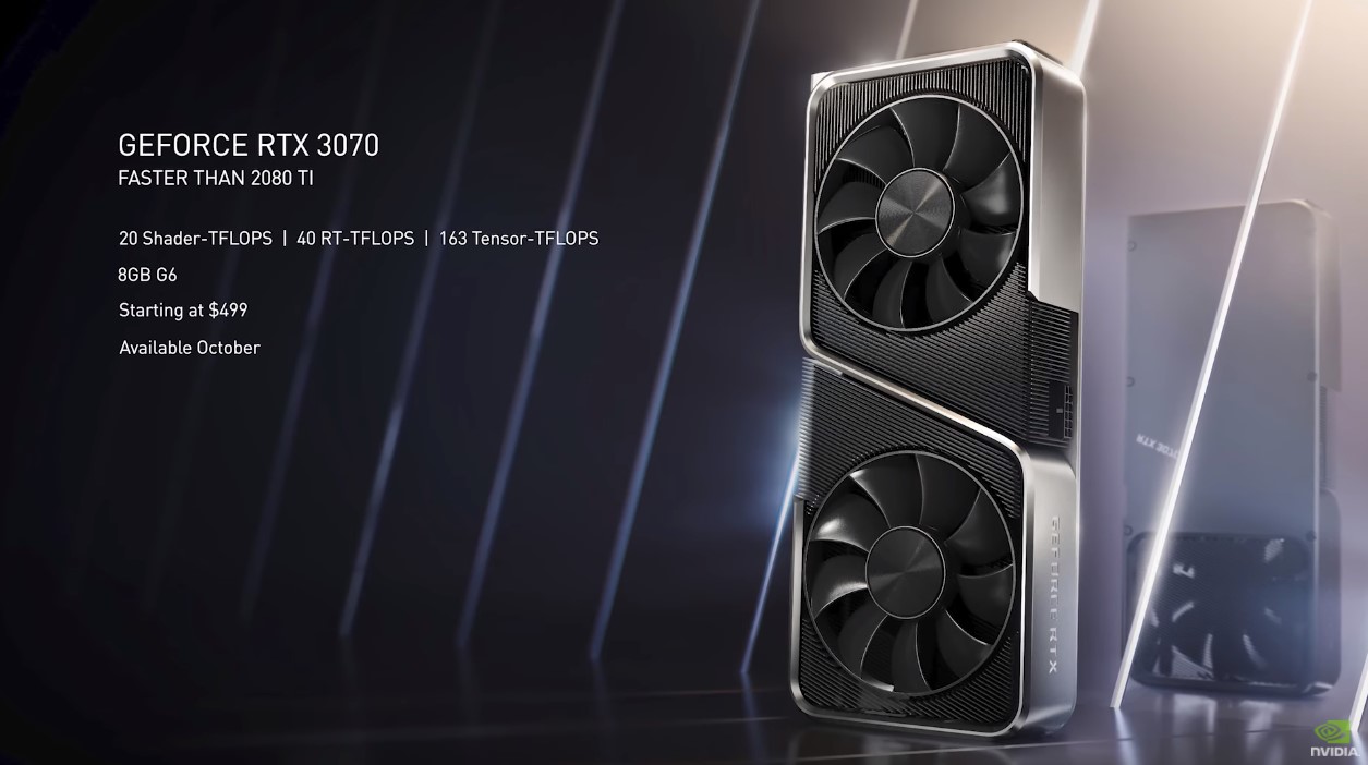 Second in line, the GeForce RTX 3070 is the smaller and cheaper counterpart to the 3080. Offering performance greater than the current benchmark of the 2080 Ti, and costing less than half of the Ti’s astronomical price, the 3070 is fully prepared to send big waves of transformation through the PC community. Huang personally took the time to address all the Pascal loyalists, letting them know: now is finally the time to upgrade. The 3070 weighs in at an easy $499, and launches in October of this year.