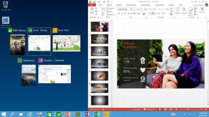 The new Task view button on the task bar enables one view for all open apps and files, allowing for quick switching and one-touch access to any desktop created.