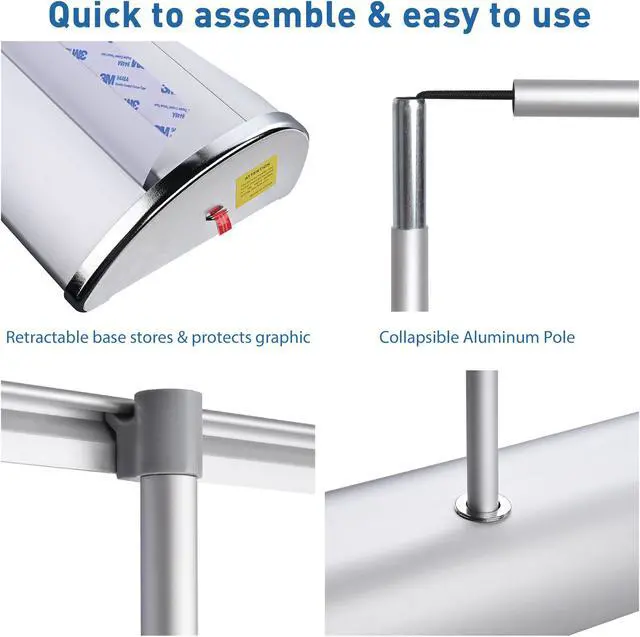 - Easy to Assemble - Quick and easy to set up, just extend the support pole, pull up the banner and attach it onto the pole via hook on the top; With 3M stickers near the top bar for allowing you to fast upload your graphic and ensuring solid attachment