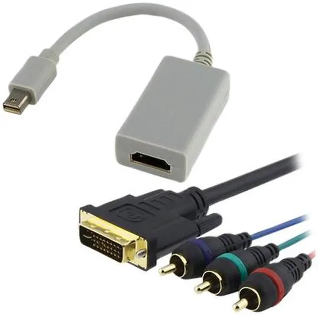 | Features | 1X DVI-I to 3 RCA Component RGB Cable M/M, 6 FT / 1.8 M, Black - Premium 6 ft DVI-I to RCA Component cable for your monitor / projector - Connects PC / laptop to LCD projector, HDTV, and other Y / Pr / Pb component RGB display system - Receives and transmits Component signals Y, Pr, PB. - Shields cable 100% with overlapped foil and copper braid. - Connectors provide maximum resistance to oxidation for error-free data transfer. - Shields for high resolution formatting. 1X Mini DisplayPort to HDMI Male / Female Adapter - The mini DisplayPort to HDMI Adapter lets you connect a high definition monitor, projector, or LCD that uses a HDMI connector or cable to a MacBook, MacBook Pro, or MacBook Air with a mini DisplayPort |