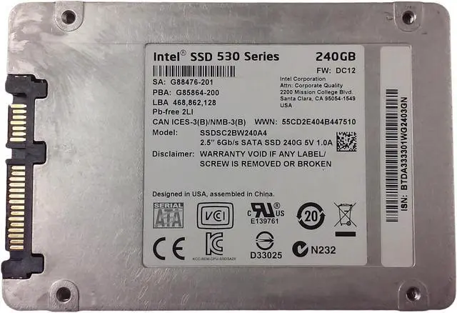 USED Intel SSDSC2BW240A4 530 Series 240GB 2.5" SATA III Solid State Drive Erased (DoD 5220.22 M Compliant) and tested good (Not formatted, partitioned, or allocated). Sold as used and in working condition. There may be drives that have up to 25 bad sectors. There may be writing or markings on the drive or the drive may vary slightly (color and/or label may differ) from picture but the model numbers will be the same.