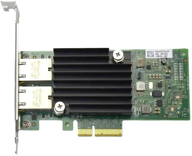 The Intel® X550-T2BLK is a dual-port 10 Gigabit Ethernet Converged Network Adapter designed for high-performance servers and workstations. It features two RJ-45 10GBase-T ports supporting auto-negotiation for 10/1/ 0.1 Gbps speeds over Cat6a/Cat7 cabling, with a PCIe 3.0 x8 interface for fast data throughput. Compliant with IEEE 802.3 an/ab/az standards, it supports advanced features like SR-IOV, VMDq, iSCSI, FCoE, DCB, jumbo frames, and Wake-on-LAN. Compatible with Windows, Linux, and VMware ESXi, the adapter includes LED indicators, full-profile bracket, and on-board memory buffers. Operating between 055°C and up to 85% humidity, it weighs approximately 180g and comes with a 1-year limited warranty.