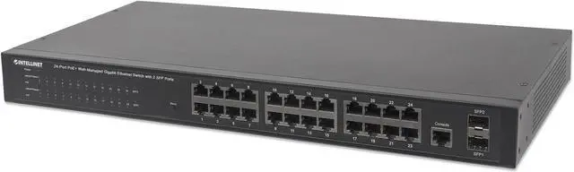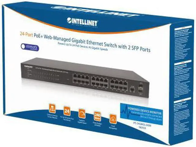 The Intellinet Network Solutions 24-Port Gigabit Ethernet PoE+ Web-Managed Switch with 2 SFP Ports (560559) is designed to pass both data and electrical power to a number of PoE-compatible devices via standard Cat5e or Cat6 network cables. Equipped with 24 Gigabit Ethernet ports, all of which support 802.3at/af Power over Ethernet (PoE/PoE+), this switch can power Wireless LAN access points and bridges, VoIP (Voice over Internet Protocol) telephones, IP surveillance cameras and more while delivering network speeds of up to 1000 Mbps.