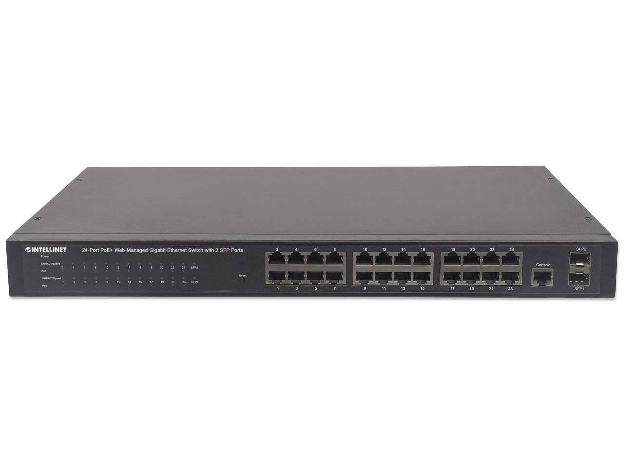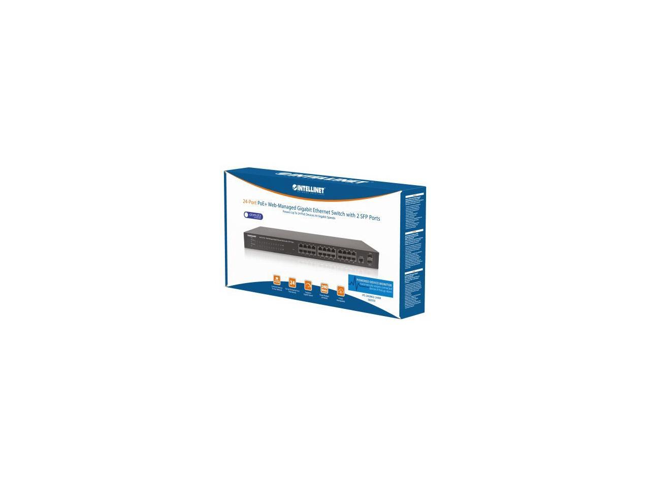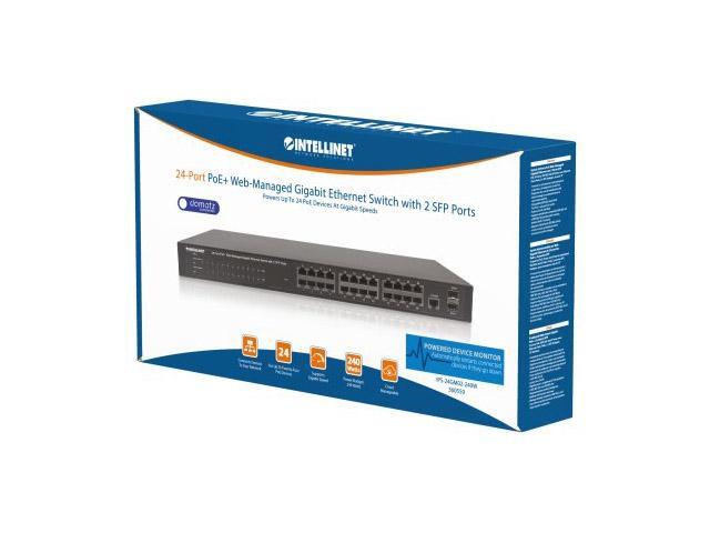 Intellinet 24-Port Gigabit Ethernet PoE+ Web-Managed Switch with 2 SFP Ports, 24 x PoE ports, IEEE 802.3at/af Power over Ethernet (PoE+/PoE), 2 x SFP, Self-Healing Network, Endspan, 19" Rackmount