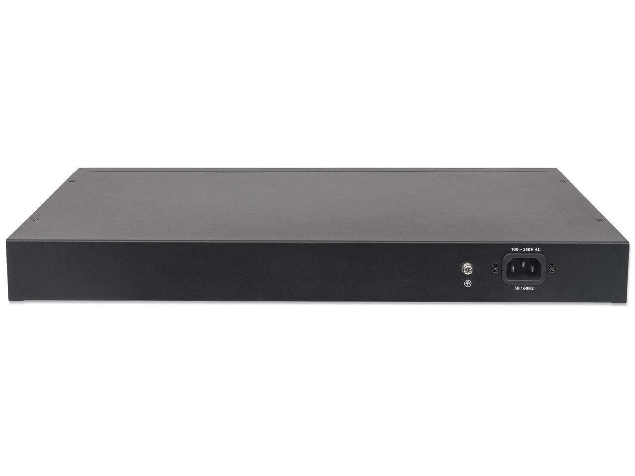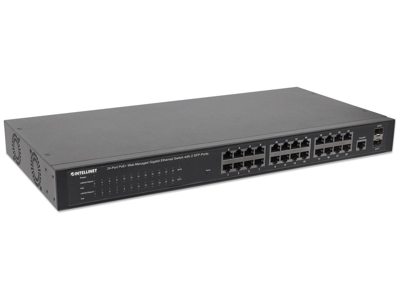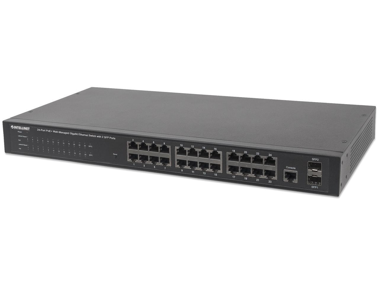 Intellinet 24-Port Gigabit Ethernet PoE+ Web-Managed Switch with 2 SFP Ports, 24 x PoE ports, IEEE 802.3at/af Power over Ethernet (PoE+/PoE), 2 x SFP, Self-Healing Network, Endspan, 19" Rackmount
