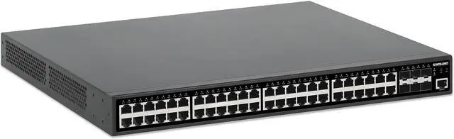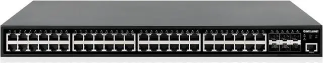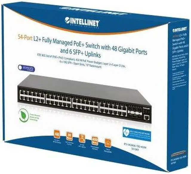 This 54-Port L2+ Fully Managed PoE+ Switch with 48 Gigabit Ports and 6 SFP+ Uplinks is one of the flagship switches from Intellinet Network Solutions. With six 10G SFP/SFP+ module slots, a PoE power budget of 450 watts, 48 Gigabit Ethernet ports and several features like VLAN, QoS, SNMP and IGMP, it is a feature-rich installers choice for medium-sized businesses.