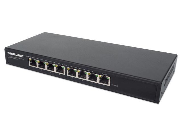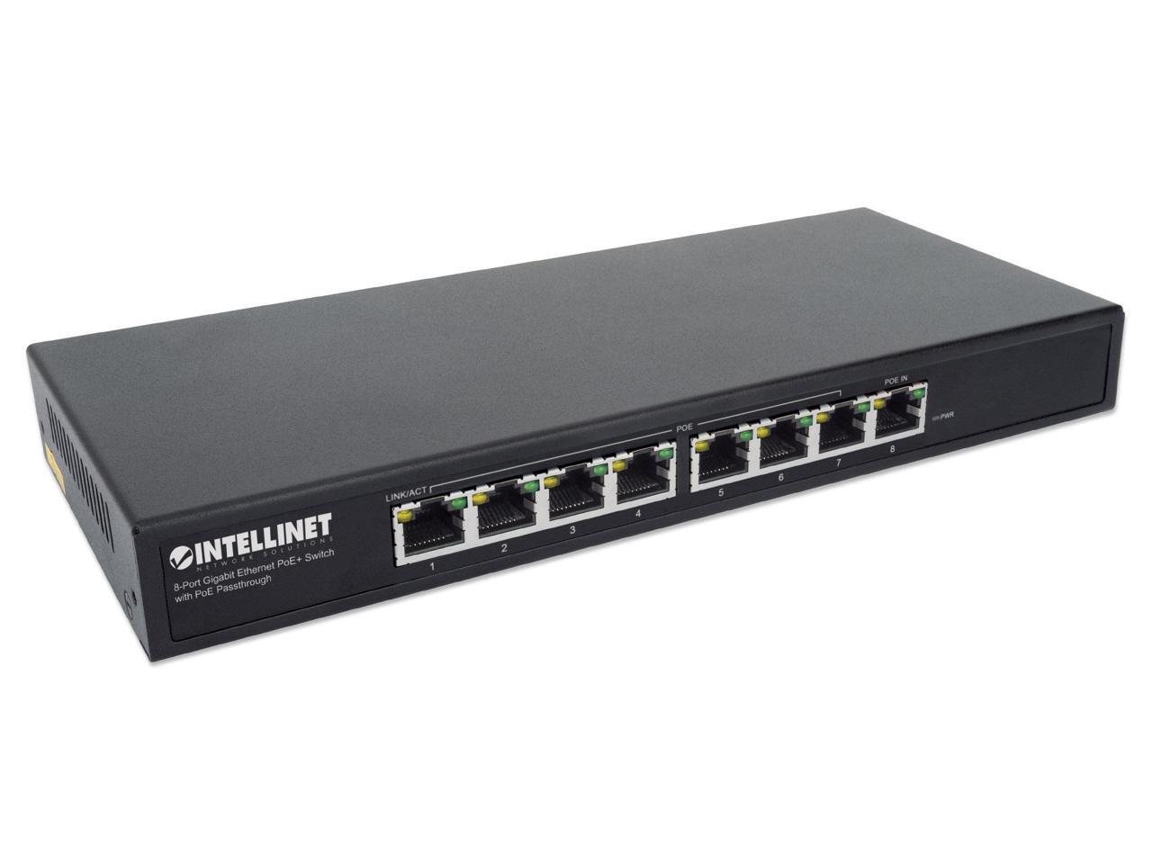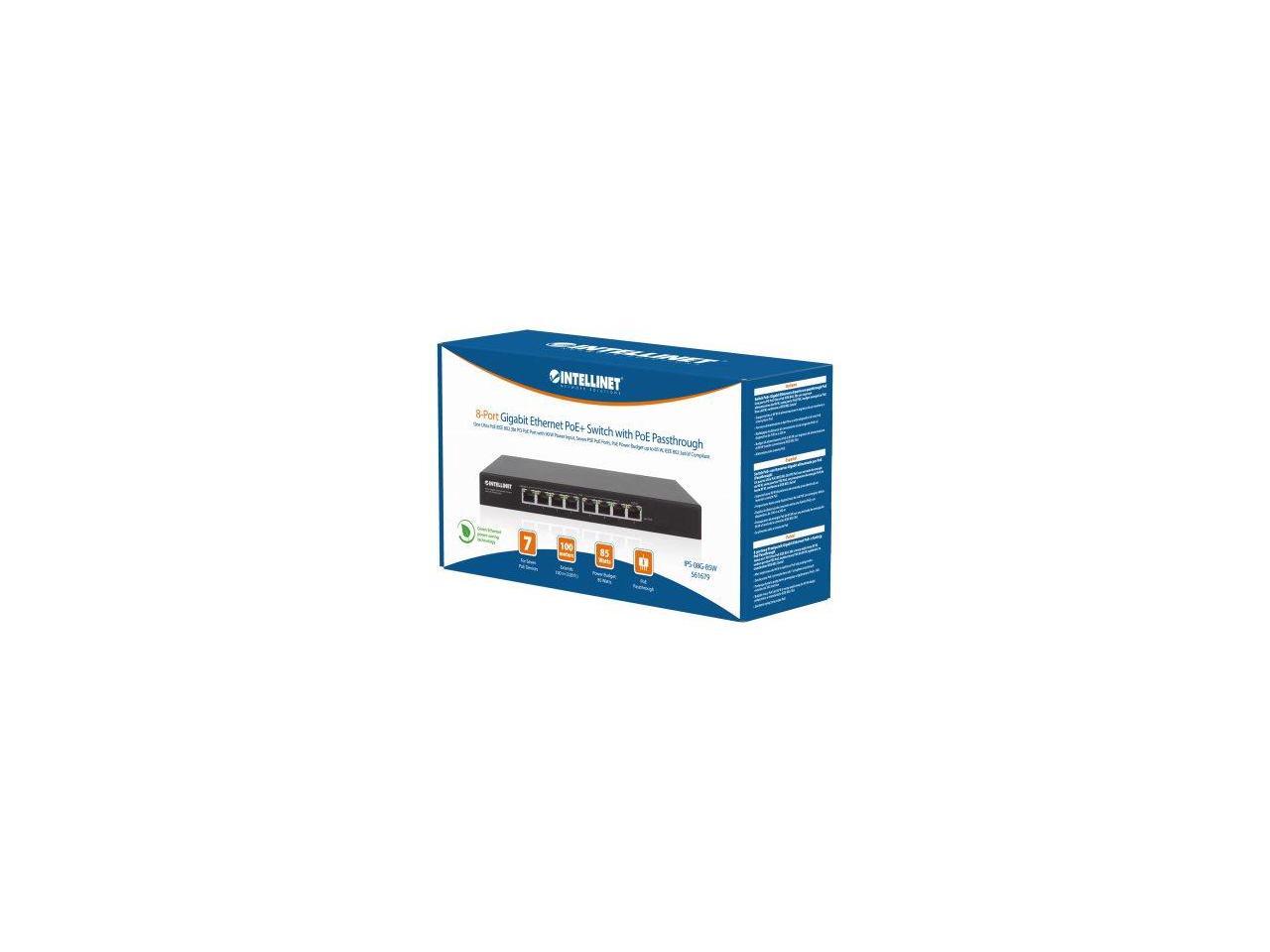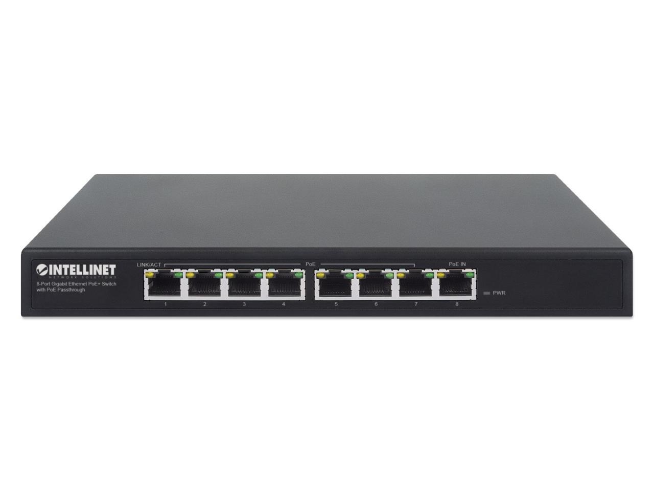 Intellinet PoE-Powered 8-Port Gigabit Ethernet PoE+ Switch with PoE Passthrough, One IEEE 802.3bt (PoE++ / 4PPoE) PD PoE Port with 90 W Power Input, Seven PSE PoE Ports, PoE Power Budget up to 85 W, I