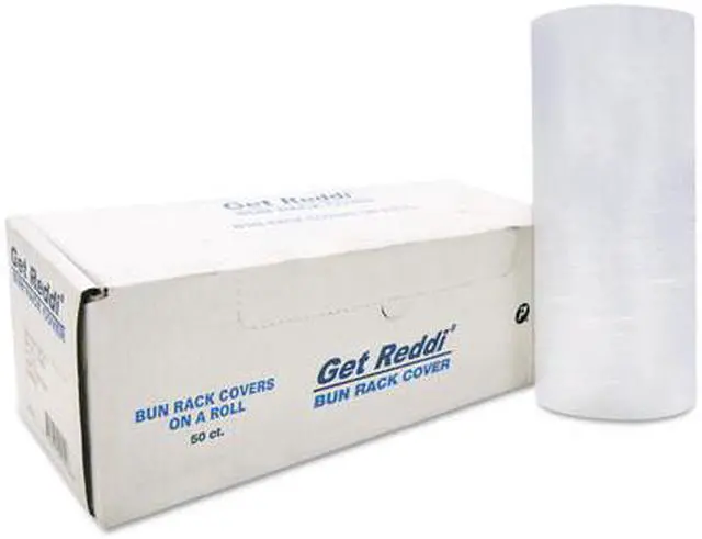 Bun rack and pan cover comes in a compact packaging which helps save on counter space. Quick-dispensing for reduced waste and easy access. Made of LLDPE film making it tough and resistant to acids, bases and vegetable oils. FDA approved for adequate food service, storage and handling. Food Container Type: Carryout; Material(s): Linear Low-Density Polyethylene; Color(s): Clear; Depth: 80". Includes 50 poly bags per case.