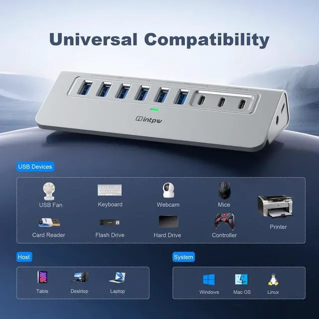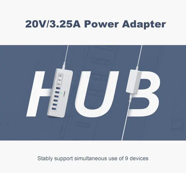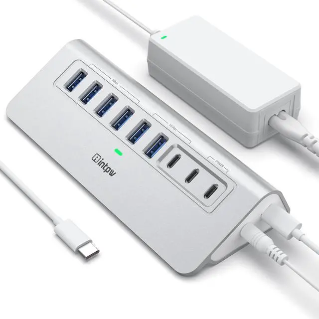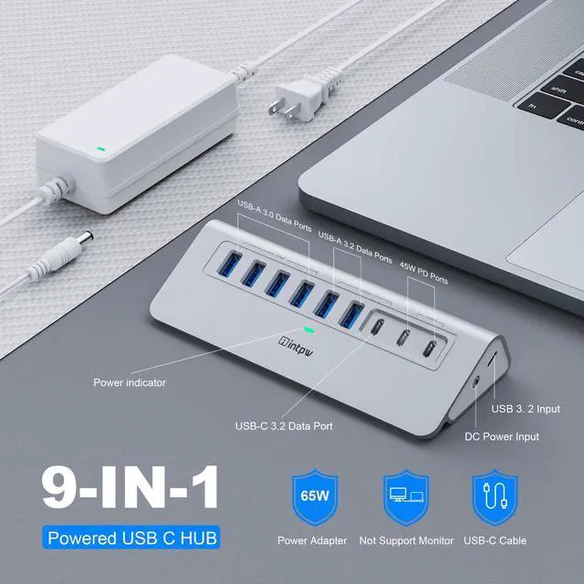 INTPW Hybrid 9-Port USB 3.2/USB C Hub with PD Port and 65W Power Adapter