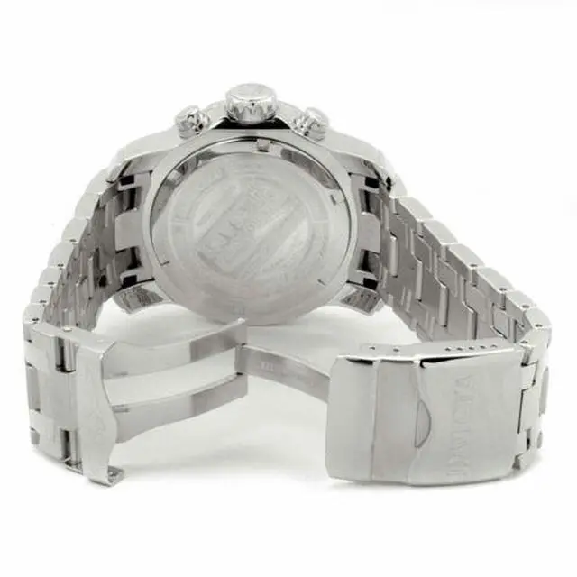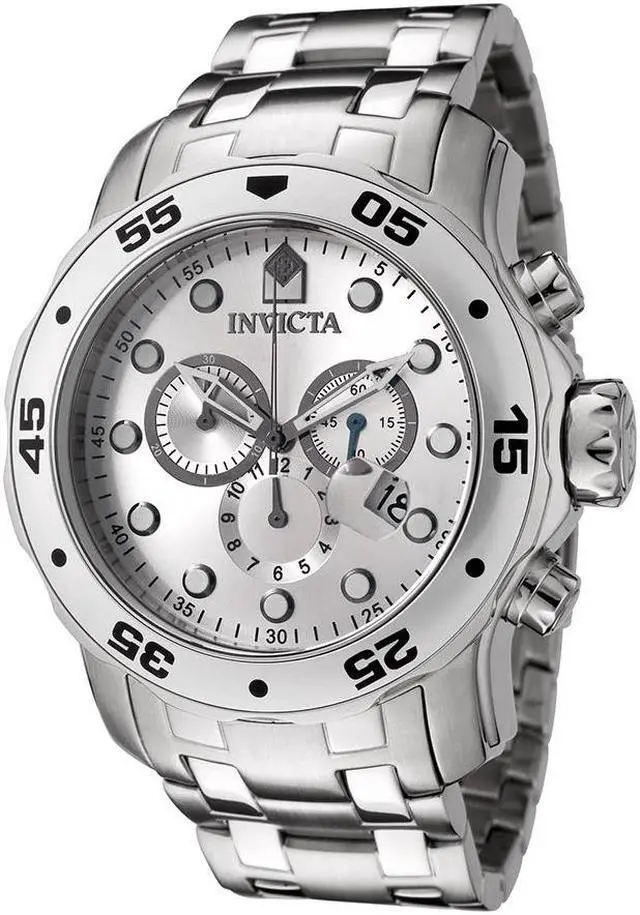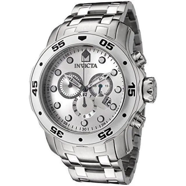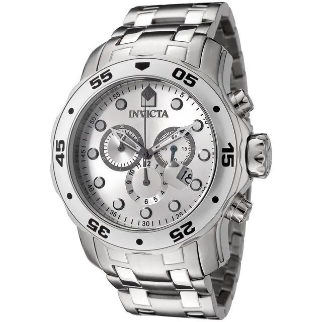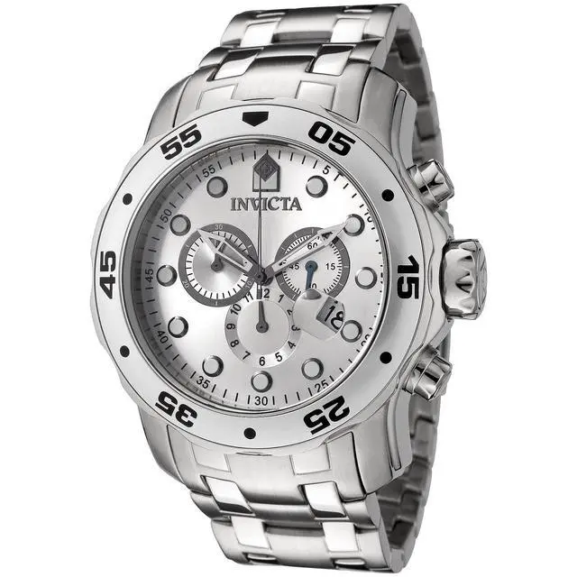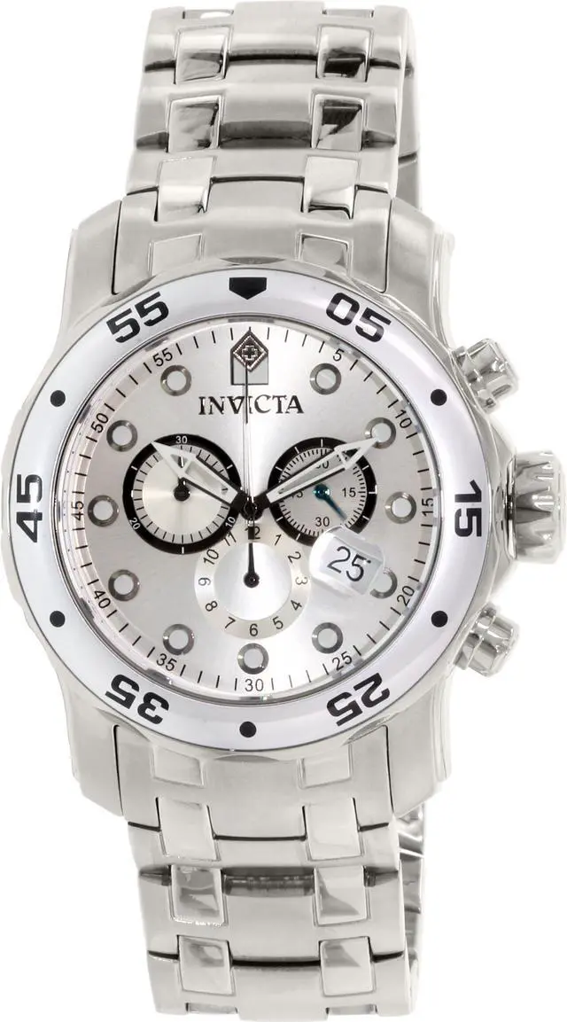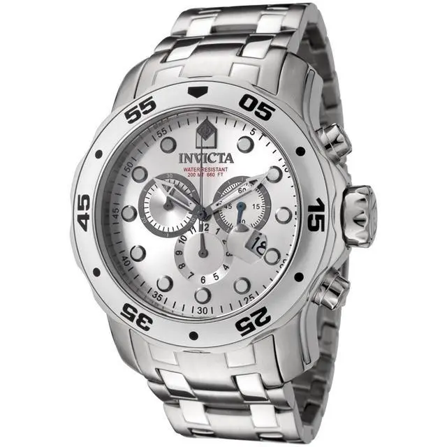 Uncompromising in its bold stature, the Invicta Men's Pro Diver Collection Stainless Steel Watch is a jewel worthy of the deep sea. Produced on brushed and polished stainless steel metal, the broad case is richly complemented by the bracelet with fold-over clasp safety. An oversized unidirectional bezel is detailed with black Arabic numerals and dot markers. The durable flame-fusion crystal window covers the striking silver analog dial, protecting the assortment of three chronograph subdials and magnified date window. Featuring luminous gunmetal hands, the dial also boasts an outer ring seconds marker and luminous circular indices at each hour position.