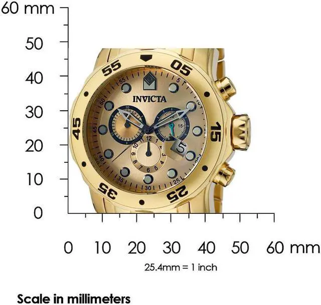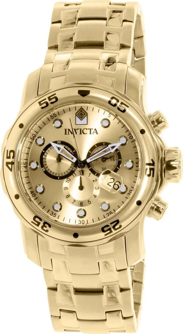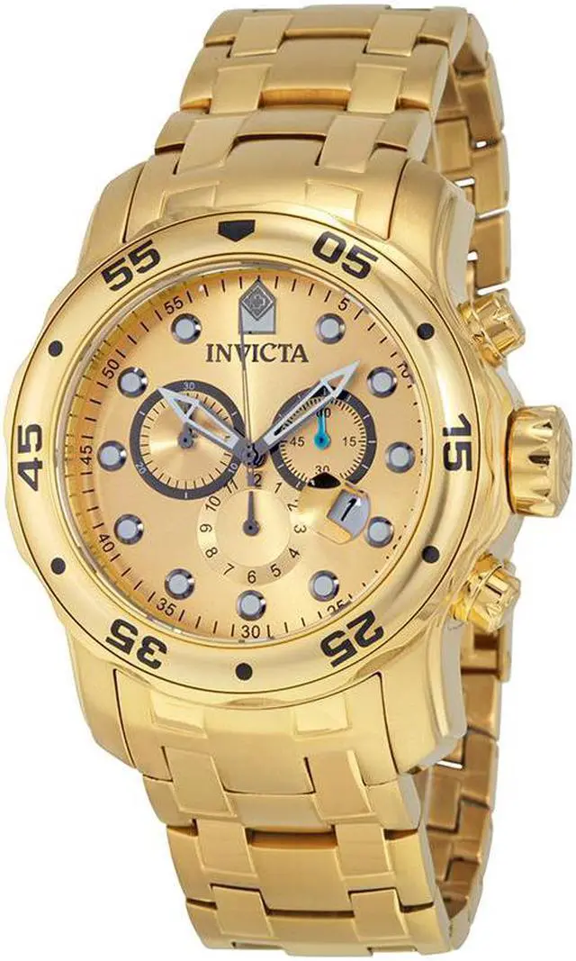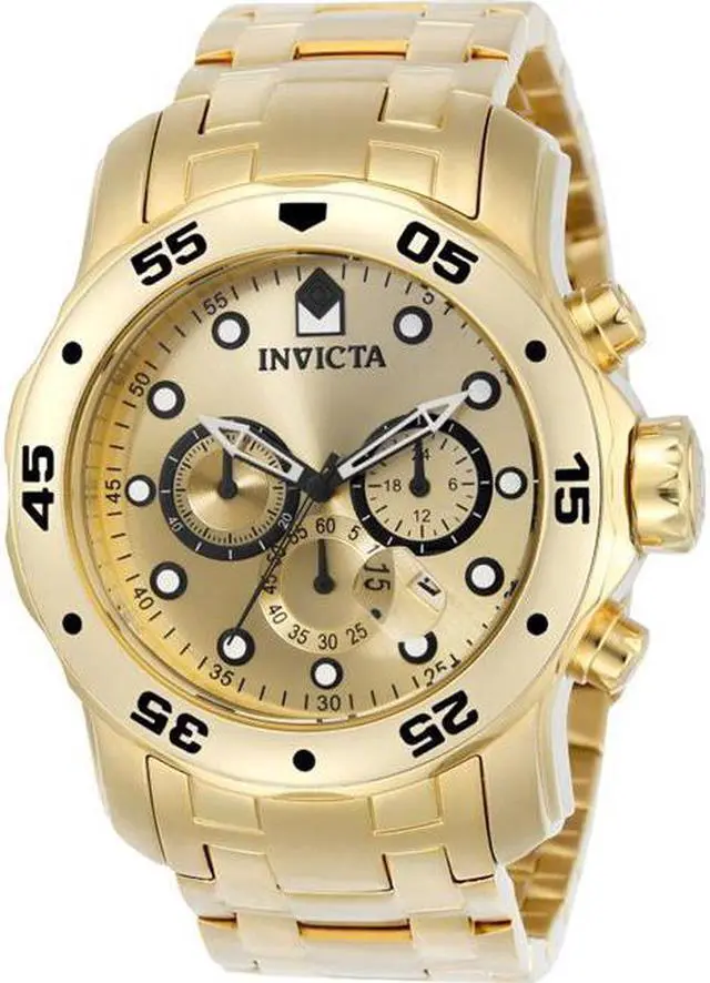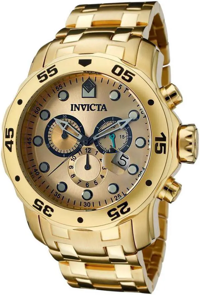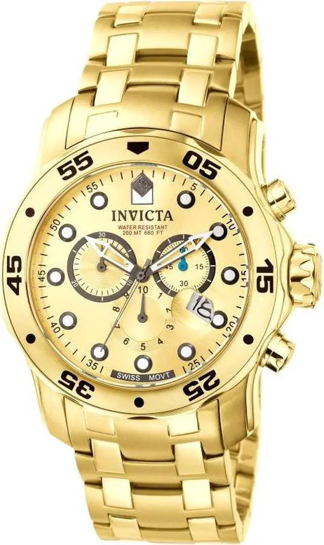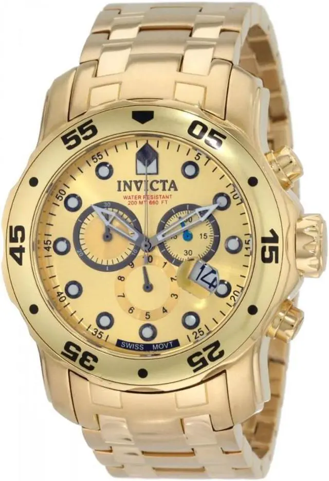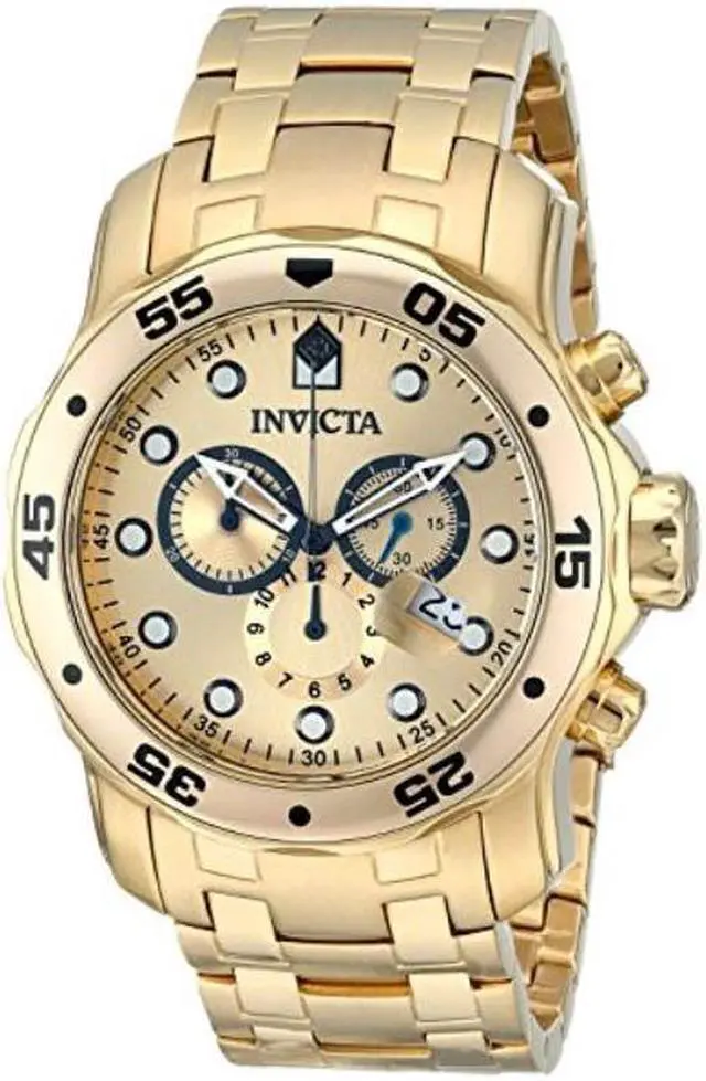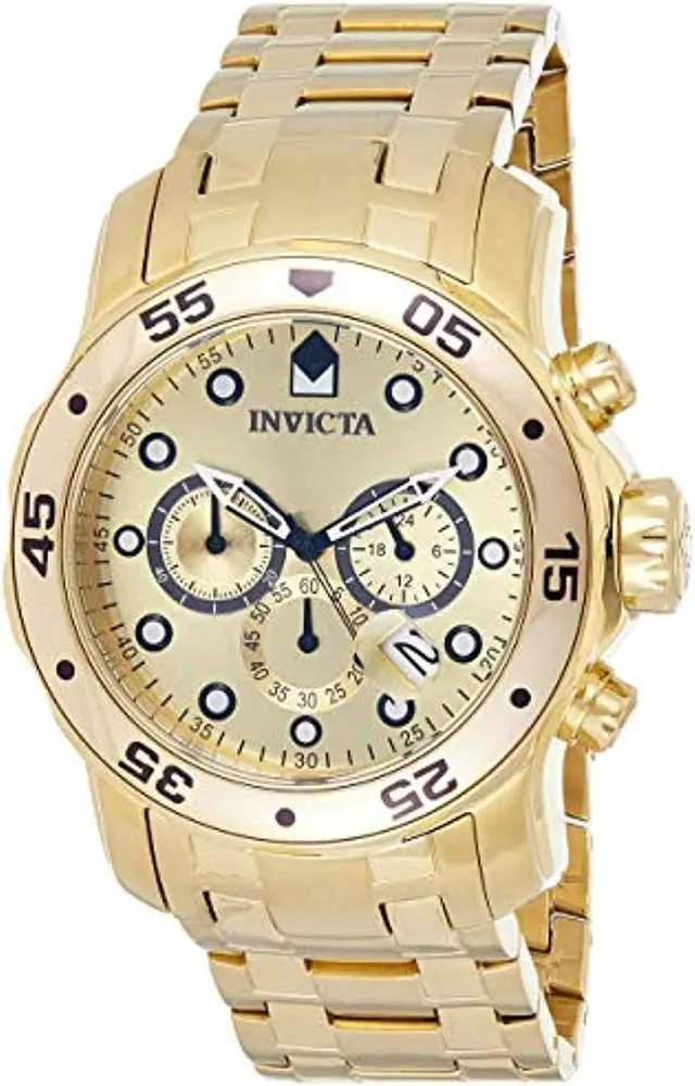 The exquisitely durable Pro Diver series from Invicta adds fashion and function to your wardrobe. The 18k gold plated stainless steel bracelet meets its gold tone unidirectional bezel in a formless finish. Its date window, subdials, chronograph and 200 meters of water resistance add in a clever touch of utility to the established aesthetic of the Invicta brand. Robust and undeniably useful, this timepiece is a perfect addition to any man's collection.