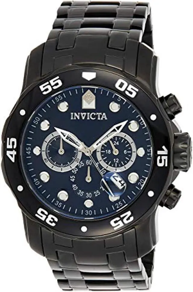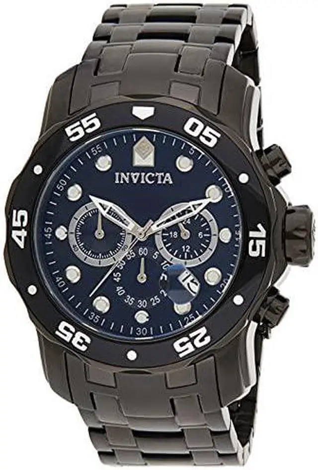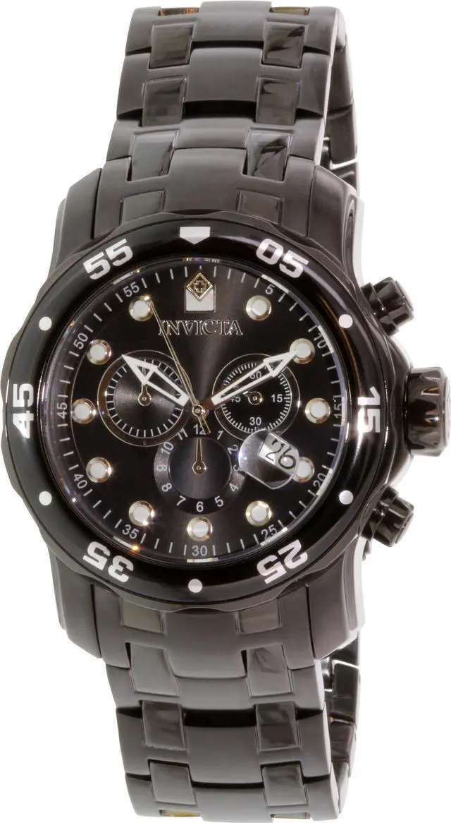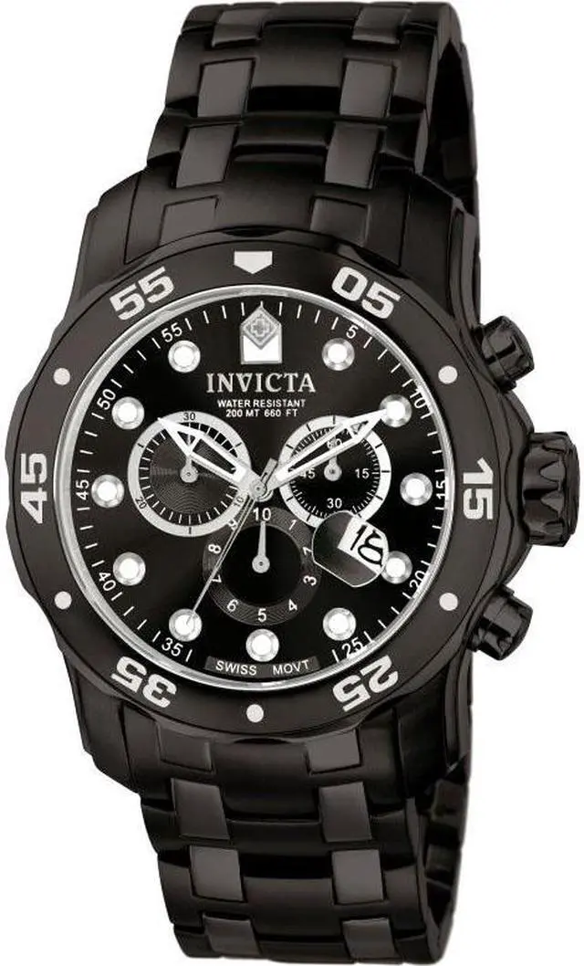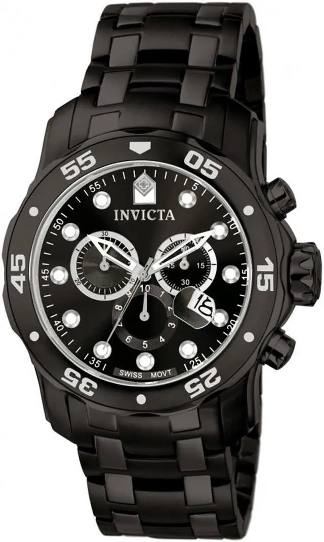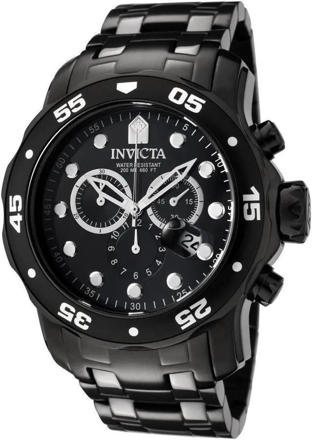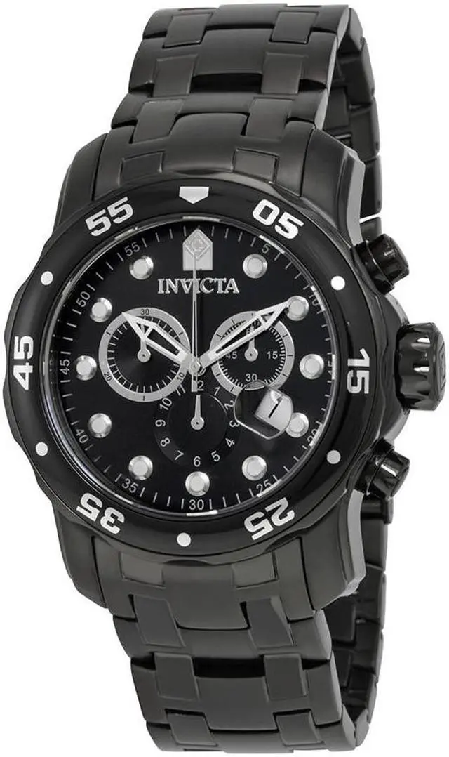 The bold and striking Invicta Men's Pro Diver Collection Chronograph Black Ion-Plated Stainless Steel Watch is ideal for the water sports enthusiast. The circular, black dial features luminous dots for hour indexes, luminous hands, and a date display at four o'clock. The three subdials offer full chronograph function while the black-ion plated, stainless steel bezel is unidirectional with five-second indexes. The oversized crown and pushers come in handy during a deepwater dive, and the flame-fusion window provides scratch resistance. The wide, black-ion plated, stainless steel bracelet features a fold-over clasp with safety button.