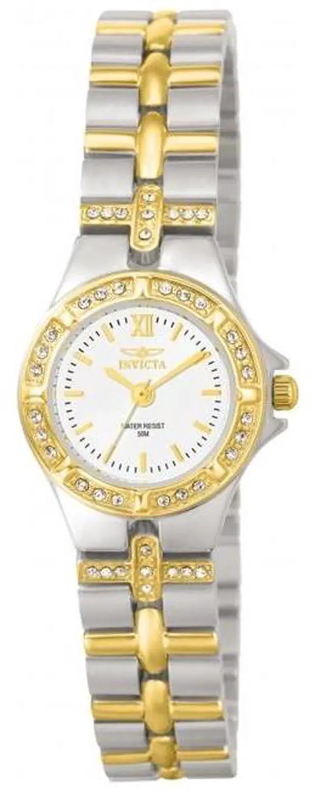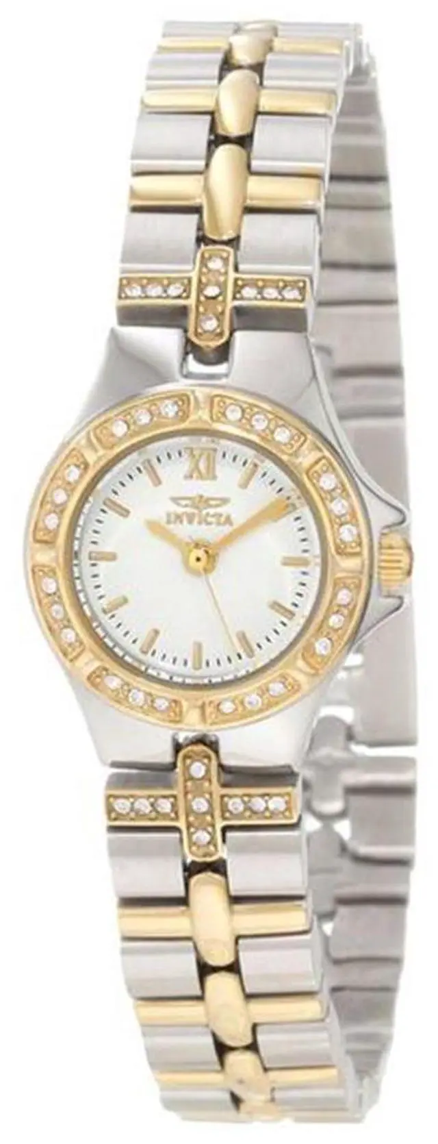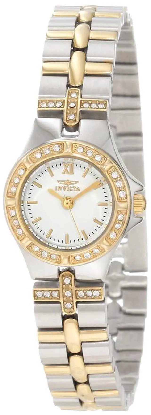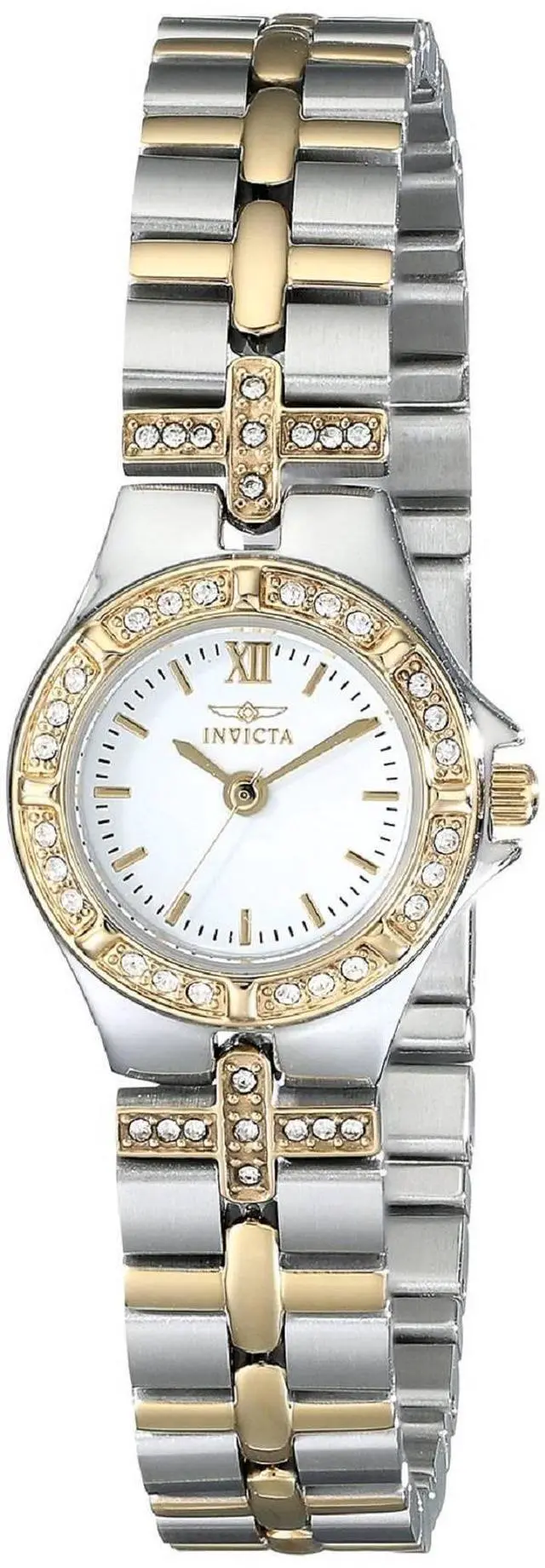 Discover the elegant design and radiant sparkle of the Invicta Women's Wildflower Collection 18k Gold-Plated and Stainless Steel Watch. A round silver dial showcases gold-tone hands, a single gold Roman numeral at the twelve o'clock position, gold baton hour indices, and black minute indices. Holding a flame-fusion crystal to protect the dial, a stationary 18k gold-plated stainless steel bezel is encrusted with 24 shimmering white crystals. Adding even more shine, the matching two-toned 18k gold-plated stainless steel bracelet features 18 white crystal accents in a decorative cross pattern where the bracelet meets the case.