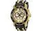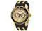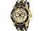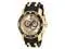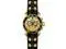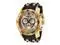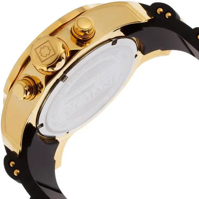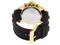 Gold-plated stainless steel case with a black polyurethane strap with gold-plated accents. Gold-plated bezel with black top ring. Gold dial with skeleton hands and dot hour markers. Minute markers around the outer rim.