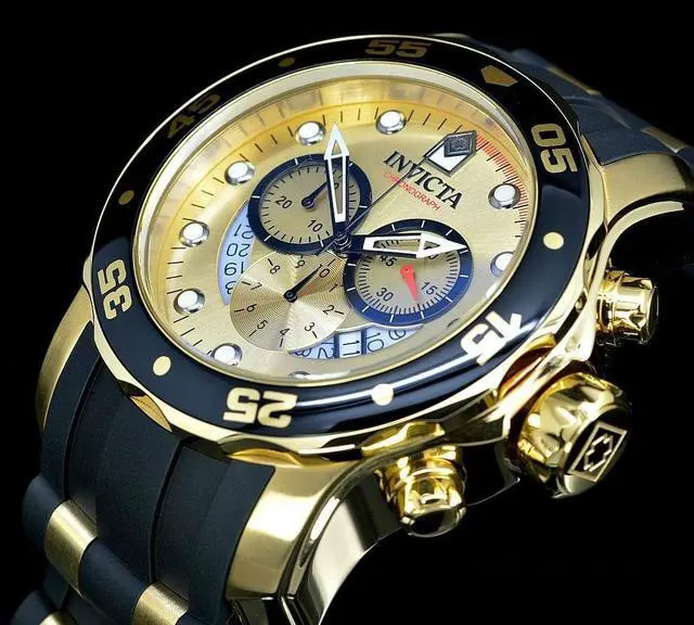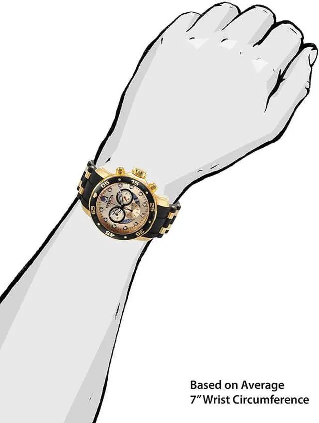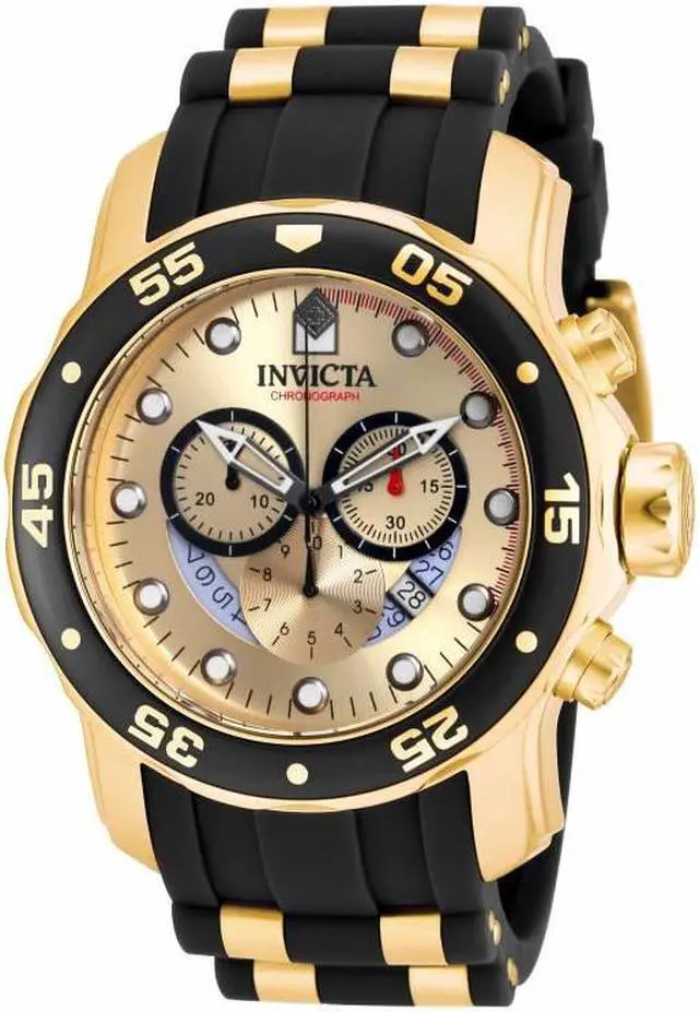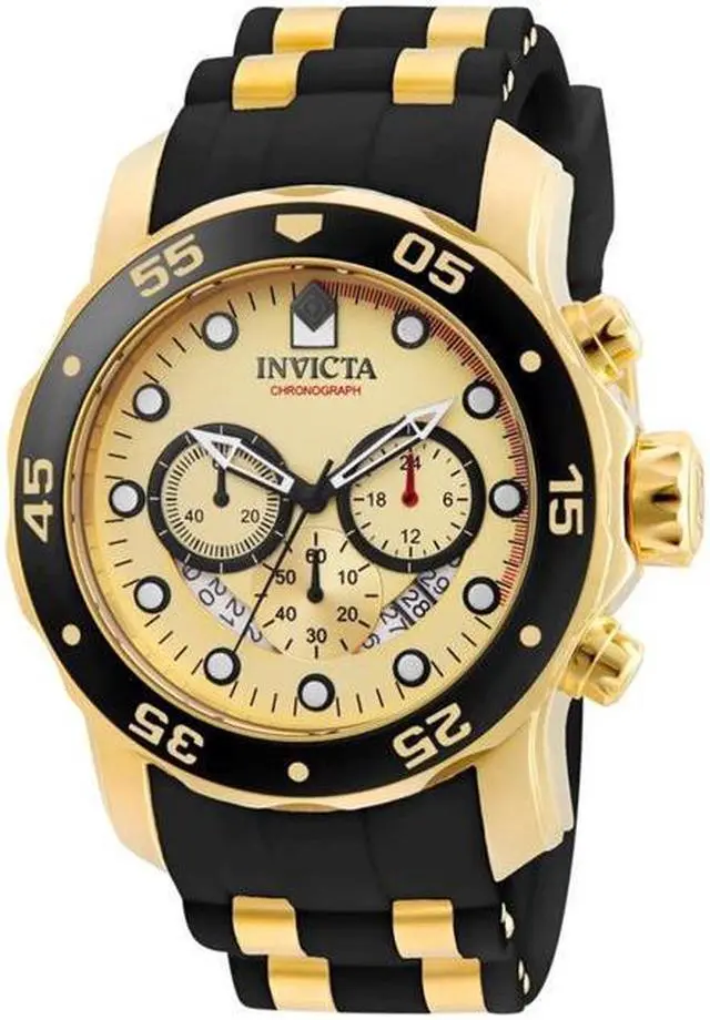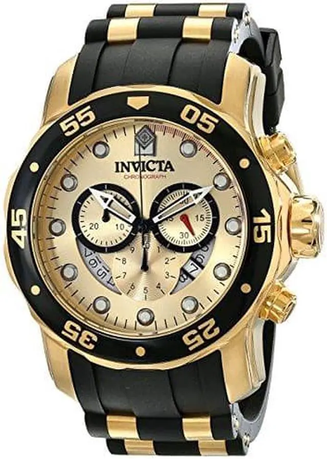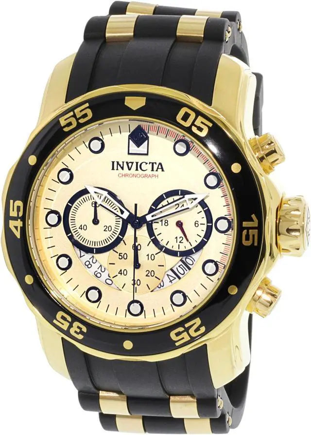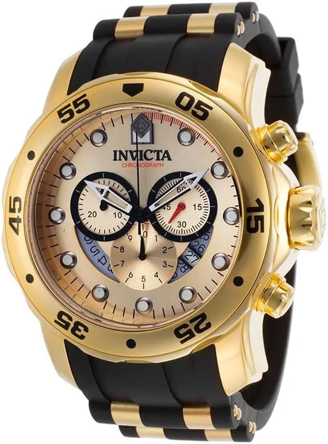 Functions: chronograph, date, hour, minute, second. Casual watch style. Invicta Pro Diver Chronograph Gold Dial Black Polyurethane Gold-plated Mens Watch 17566.