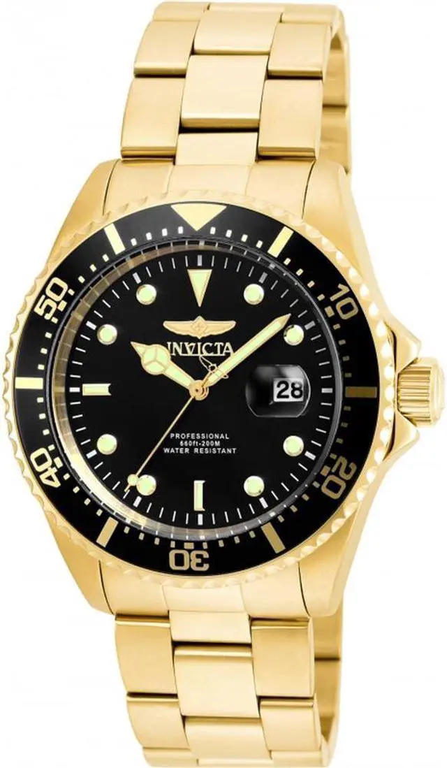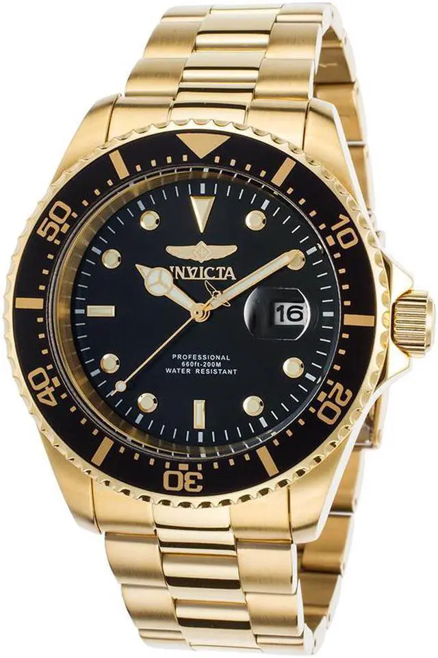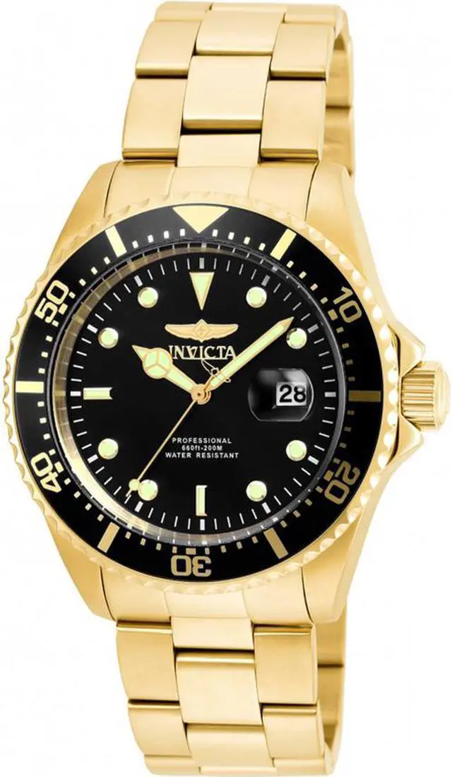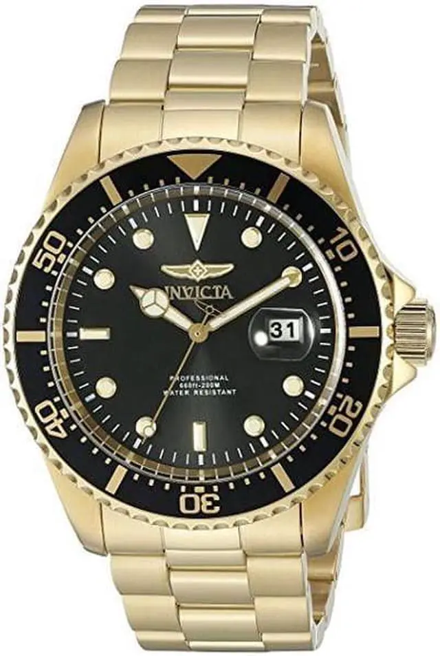 Invicta Men's 'Pro Diver' Quartz Stainless Steel Casual Watch (Model: 22062) The Pro Diver collection by Invicta is stylish, smooth, and versatile. Its comfortable bracelet, calming black dial, luxurious 18K gold plating and spectacular 200 meter water resistance capability make this particular timepiece a must-have for any man's collection. Complete yours today. With its most inspired creations yet, Invicta demonstrates its technical and design prowess, offering timepieces of style for extreme value. "We have long held firm to the belief that supremely crafted timepieces can be offered for extremely modest sums. It is the founding principle of our flagship and the radical notion that still drives us today. By being true to our convictions, we will continue to turn the balance of power, and deliver true Swiss luxury to anyone who desires it. Let all those who possess our timepieces and pass through our doors witness the quality, value and care in every piece we create, and the spirit of never-ending possibilities in everything we do. "These are the words that greet visitors and motivate team members inside the Invicta Watch Group's new worldwide headquarters. Emblazoned in stainless steel, it has been the Invicta message since Day One. With each new timepiece, the company sends up a flare for those looking to be defined not by how much they spend, but how wisely they spend. With its strong collections, the gutsy Swiss brand is guaranteed to keep attracting followers. It takes years of training and a great deal of pride to achieve glorious Swiss timepieces by hand. But it takes guts and the courage of your convictions to make those timepieces affordable for everyone who appreciates them. At our Swiss workshops, we mix time-honored traditions with a little bit of horse sense every single day to produce the greatest values in the watch-making world. See all Product description